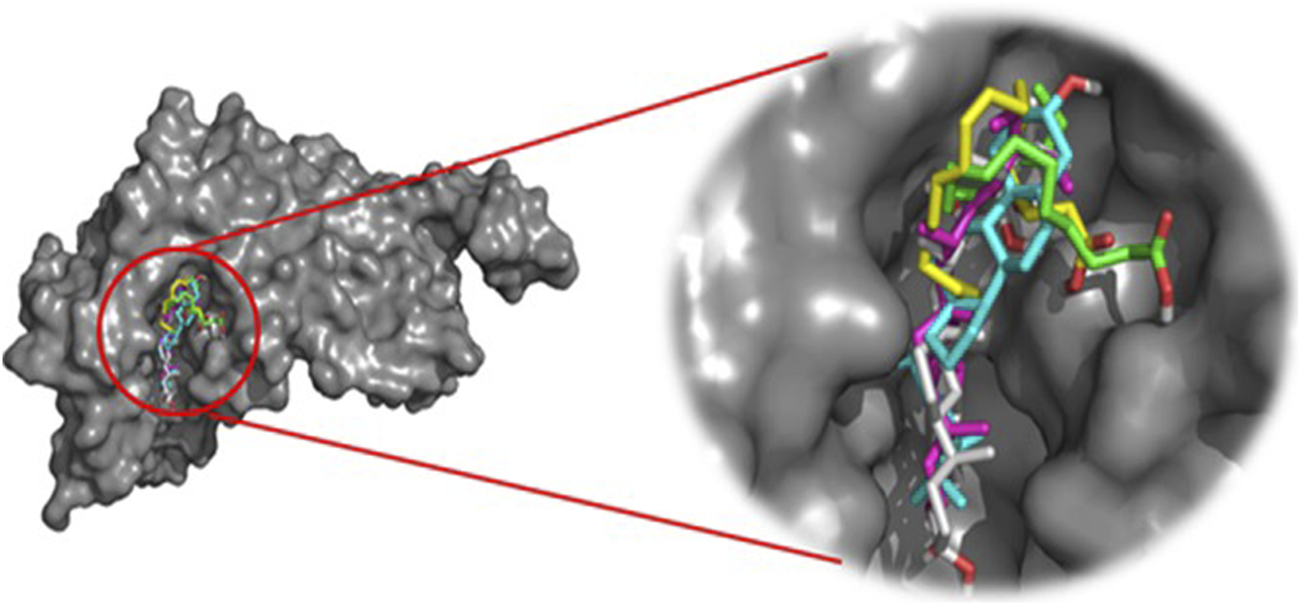 In-silico interaction analysis was performed using the AutoDock 4.2 program package (Trott and Olson, 2010). The crystal structure of the target receptor (PDB: 6mki) (Moon et al., 2018) was retrieved from the RCSB Protein Data Bank (https://www.rcsb.org/). The target protein was prepared by removing the co-crystallized ligand and water molecules, and by adding any missing hydrogen atoms and Gasteiger charges. AutoDock Tools were used to save the files for the tested ligands and the target protein (PDBQT format). The optimization of all compound geometries was done using ACD (3D viewer) software (http://www.filefacts.com/acd3d-viewer-freeware-info). At the same time, the visualization and analysis of interactions were conducted using Discovery Studio 2017R2 (https://www.3dsbiovia.com/products/collaborative-science/biovia-discovery-studio/) and PyMOL (The PyMOL Molecular Graphics System, Version 1.2r3pre, Schrödinger, LLC).