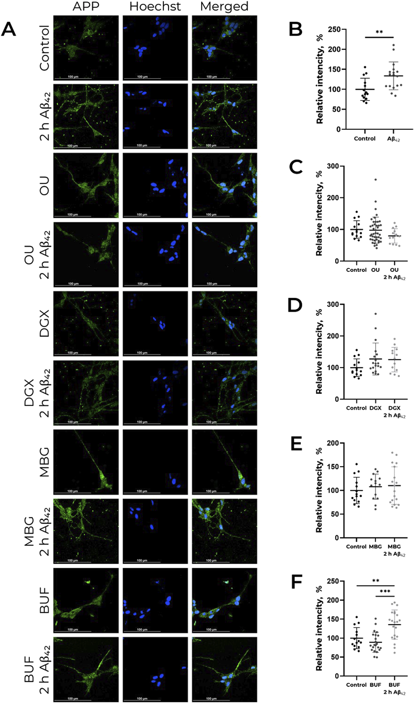 CTS impact on Аβ42-induced APP increase in neurites in human neuroblastoma cells SH-SY5Y. (А) Localization of APP in cells in presence of CTS or CTS with Аβ42 combined, incubation time 2 h. The data is provided on the APP distribution change under the action of Аβ42(B), ouabain (OU), (C) digoxin (DGX), (D) marinobufagenin (MBG), (E) and bufalin (BUF), (F) All compounds were used in 100 nM concentration. APP was labeled with AlexaFluor® 488-conjugated antibodies and is indicated by green color, nuclei are stained with NucBlue (Hoechst 33342) and indicated by blue color. For each incubation time, the ratio of fluorescence in neurites and cell bodies was calculated, and the values were normalized to the control. One-way ANOVA with post hoc Tukey test for multiple comparisons were used. Mean values ± SD, n = 3 from at least three independent fields are shown. ** – p < 0.01, *** – p < 0.001 compared to the control.