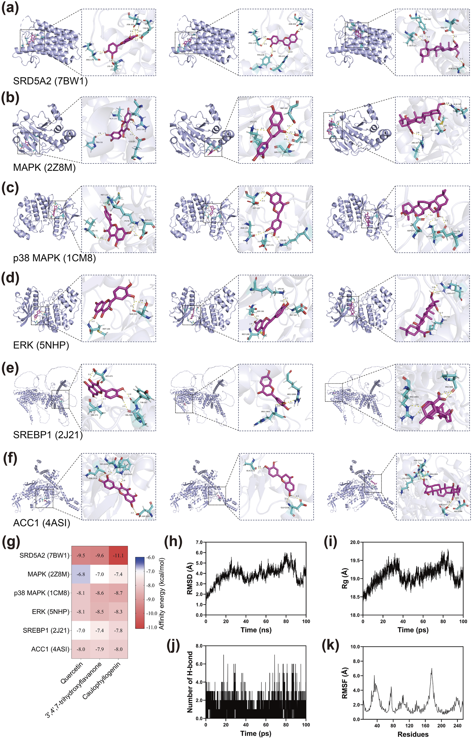 To validate the binding interactions between active compounds and target proteins identified through network pharmacology analysis, molecular docking studies were performed. Based on the degree values obtained from the protein-protein interaction network, the top three compounds with the highest degree values were selected for docking studies. These compounds were quercetin, 3′,4′,7-trihydroxyflavanone, and caulophyllogenin. The three-dimensional crystal structures of six key target proteins were retrieved from the RCSB Protein Data Bank (http://www.rcsb.org/) and saved in PDB format. These proteins included SRD5A2 (PDB ID: 7BW1), MAPK (PDB ID: 2Z8M), p38 MAPK (PDB ID: 1CM8), ERK (PDB ID: 5NHP), SREBP1 (PDB ID: 2J21), and ACC1 (PDB ID: 4ASI). The molecular structures of the three active compounds were downloaded from the PubChem database (https://pubchem.ncbi.nlm.nih.gov/) and saved in SDF format.
