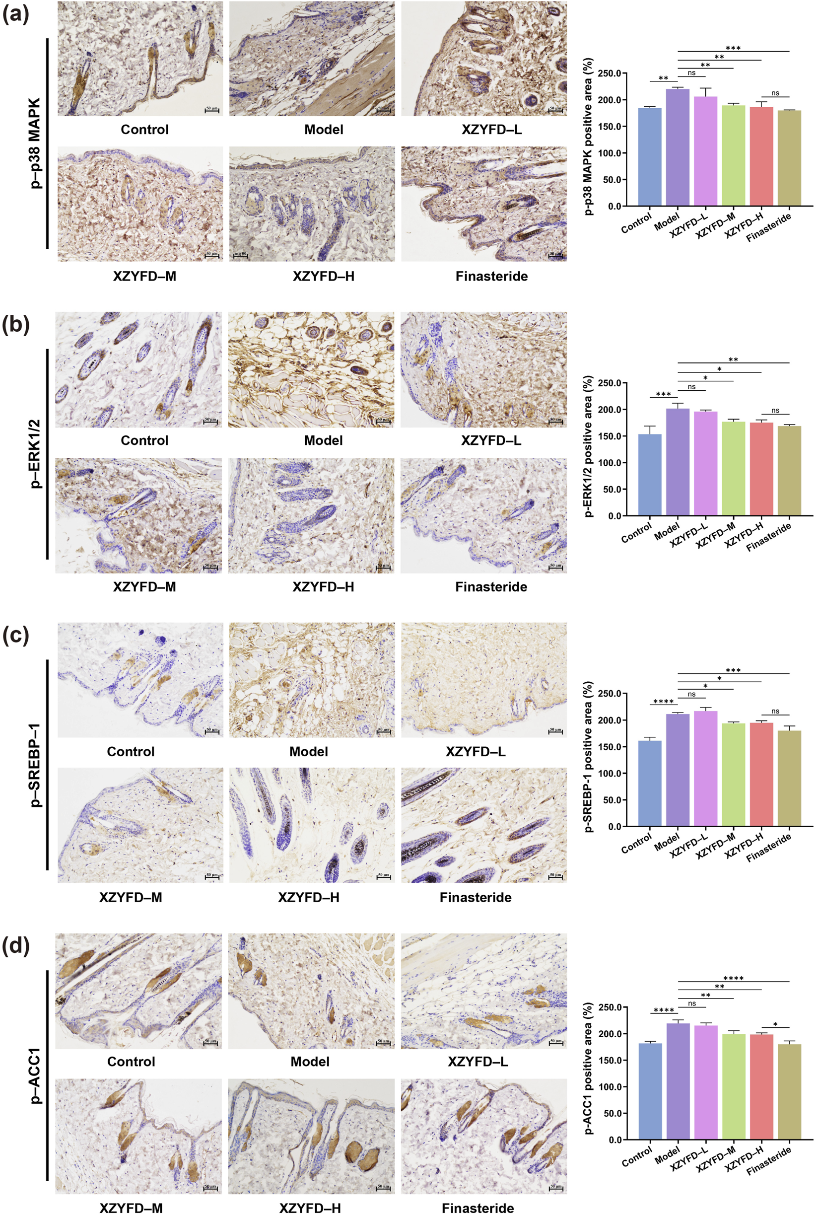 Dorsal skin tissues were collected and immediately snap-frozen in liquid nitrogen, then stored at −80 °C until protein extraction. Tissues were homogenized in RIPA lysis buffer containing protease and phosphatase inhibitors using a tissue homogenizer. The homogenates were centrifuged at 12,000 × g for 15 min at 4 °C, and the supernatants were collected. Protein concentrations were determined using the BCA protein assay kit according to the manufacturer’s instructions. Equal amounts of protein (30 μg) were separated by SDS-PAGE and transferred to PVDF membranes. Membranes were blocked with 5% non-fat milk in TBST for 1 h at room temperature, then incubated with primary antibodies overnight at 4 °C. The target proteins analyzed included 5α-reductase 2, p-p38 MAPK, p-ERK1/2, p-SREBP-1, and p-ACC1, with β-actin serving as the loading control. After washing with TBST, membranes were incubated with HRP-conjugated secondary antibodies for 1 h at room temperature. Protein bands were visualized using ECL detection reagent and captured using a chemiluminescence imaging system. Band intensities were quantified using image analysis software and normalized to β-actin levels.