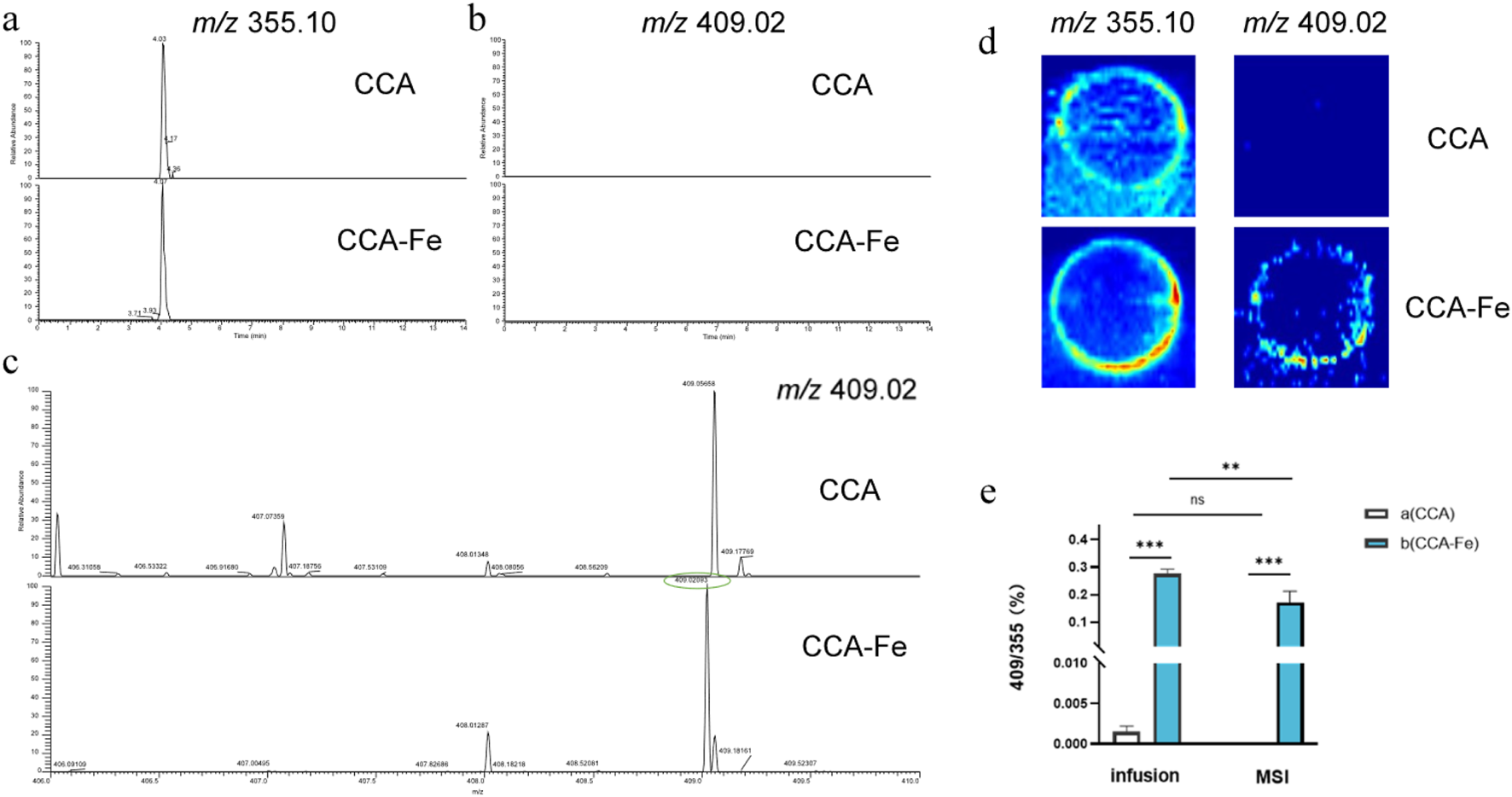In these experiments, MSI as well as two injection modalities of the ESI-MS assay, namely, infusion and UPLC injection, were investigated. As shown in Figures 2a–d, only CGAs are detected when the reaction supernatant was injected with UPLC, possibly owing to the unstable decompositions of the supramolecules or dead adsorption on the column. During MS, the unreacted CCA (m/z = 355.10) as well as compounds with m/z values of 409.02, 408.01 (Fe), 416.01, and 417.02 (Cu) were detected in the reaction solution. At the same time, the adduct ions of CGA are generated, which are consistent with the precursor ion peaks of the supramolecules; however, their abundances are much lower than those of the supramolecules, such that the supramolecules can be identified by the ratio of the precursor ion peak of the CGA (m/z = 355). By comparing the two injection modes of infusion and MSI, it was found that infusion was more suitable for detection owing to the issue of extraction efficiency, as shown in Figure 2e. After a simple optimization of the MS conditions, the samples were retested under the infusion mode with the following conditions: flow rate of 10 μL min–1, auxiliary gas flow rate of 35 arbitrary units, capillary temperature of 300 °C, and spray voltage of 3 kV.