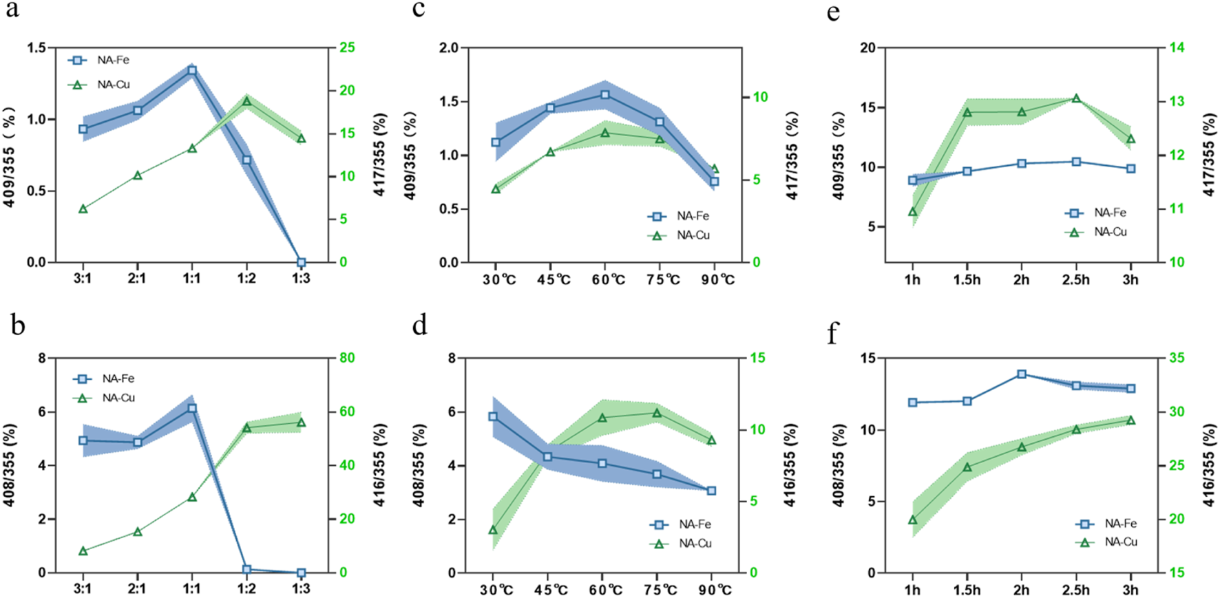 Influences of (a, b) molar ratio of the origin drug to metal, (c, d) reaction temperature, and (e, f) reaction time on the supramolecular complexes.
