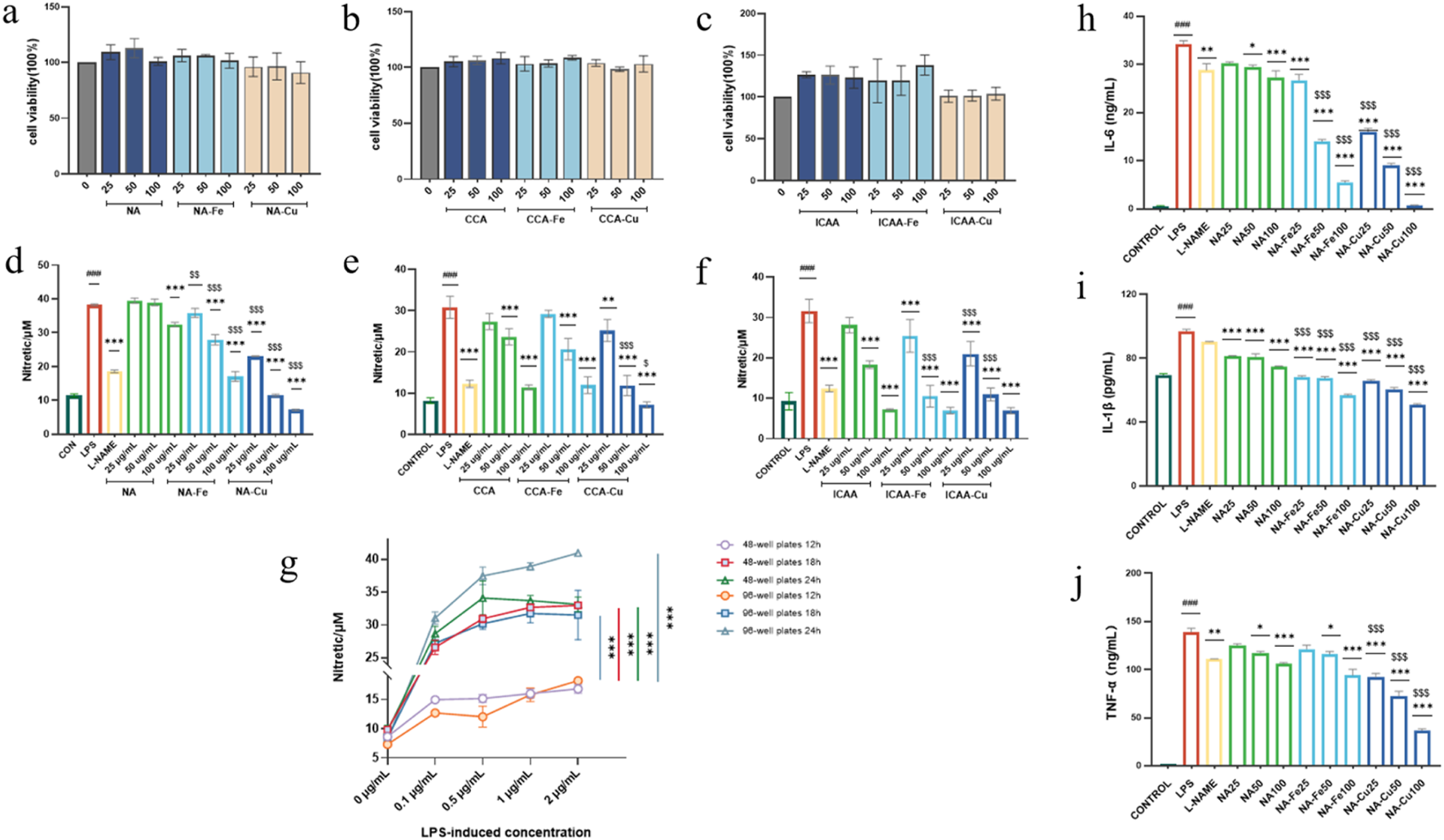 (a–c) Cytotoxicity analysis of different chlorogenic-acid (CGA)-based drugs and their supramolecular complexes on RAW264.7 cells. (d–f) Inhibitory effects of different CGA-based drugs and their supramolecular complexes on the production of NO. (g) Inflammation induction using different concentrations (0, 0.1, 0.5, 1, and 2 μg mL–1) of lipopolysaccharide (LPS) on RAW264.7 cells seeded in 96-well and 48-well plates for 12, 18, and 24 h. (h–j) Ability of neochlorogenic acid (NA) and it supramolecular complexes (NA–Fe and NA–Cu) applied at different concentrations to inhibit inflammatory cytokines IL-6, TNF-α, and IL-1β, respectively. The data are presented as mean ± standard deviation (n = 3); “*” compared to the LPS group, *p < 0.05, **p < 0.01, ***p < 0.001; “$” compared to the chlorogenic acids group, $p < 0.05, $$p < 0.01, $$$p < 0.001; “#” compared to the control group, ###p < 0.001.