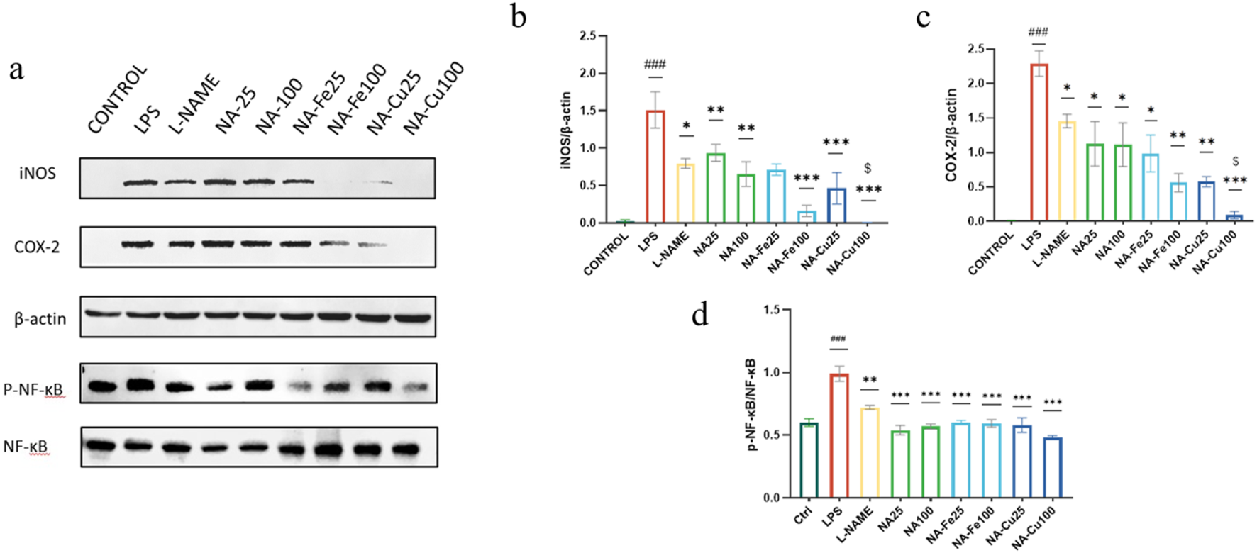 To detect iNOS expression, the cells were cultured on a 24-well plate for 24 h, followed by treatment with NA, NA–Fe, and NA–Cu, and finally stimulated with 500 ng mL–1 of LPS for 18 h. To identify iNOS expression, the cells were fixed with 4% paraformaldehyde, permeabilized with 0.1% Triton X-100, and blocked with 5% bovine serum albumin. The iNOS antibody was incubated sequentially with the cells overnight at 4 °C and Alexa Fluor 488-labeled goat anti-rabbit IgG (H + L) for 1 h at room temperature, followed by washing with PBS buffer. All images were captured using a ZEISS LSM 980 device with Airyscan 2 (Carl Zeiss Inc., Oberkochen, Germany).
