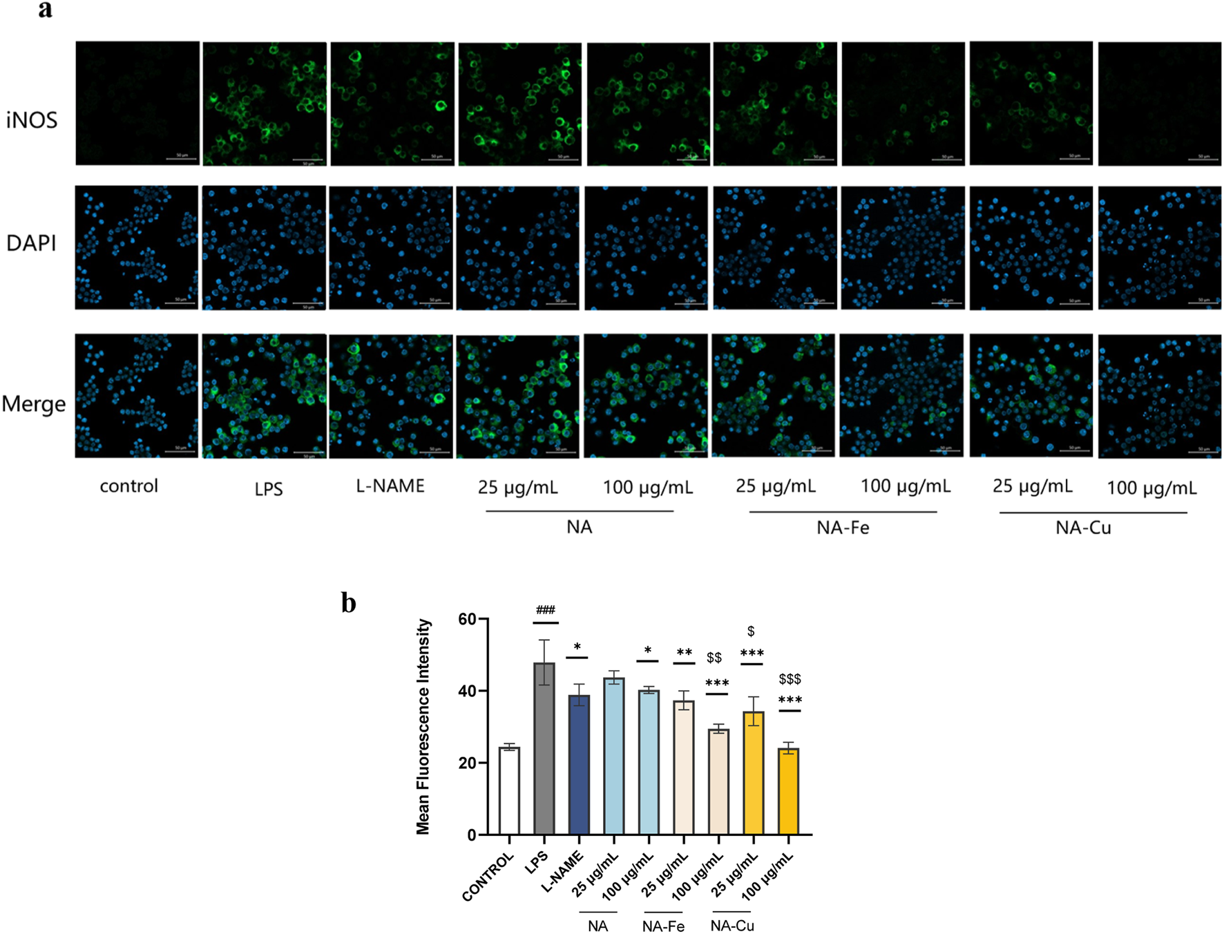 Immunofluorescence intensities of the expression of iNOS after treatment with NA and its supramolecular complexes (a) based on ImageJ measurements and (b) under different treatments compared to the LPS group. The data are presented as mean ± standard deviation (n = 3); “*” compared to the LPS group, *p < 0.05, **p < 0.01, ***p < 0.001; “$” compared to the chlorogenic acids group, $p < 0.05, $$p < 0.01, $$$p < 0.001; “#” compared to the control group, ###p < 0.001.