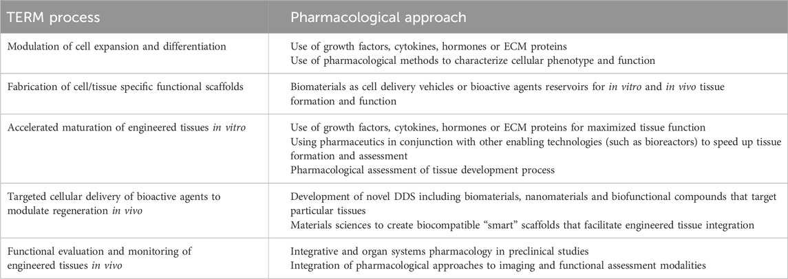 Table 1. Potential roles of pharmacology in tissue engineering and regenerative medicine (TERM) processes. Adapted from (Andersson and Christ, 2007; Christ et al., 2013).