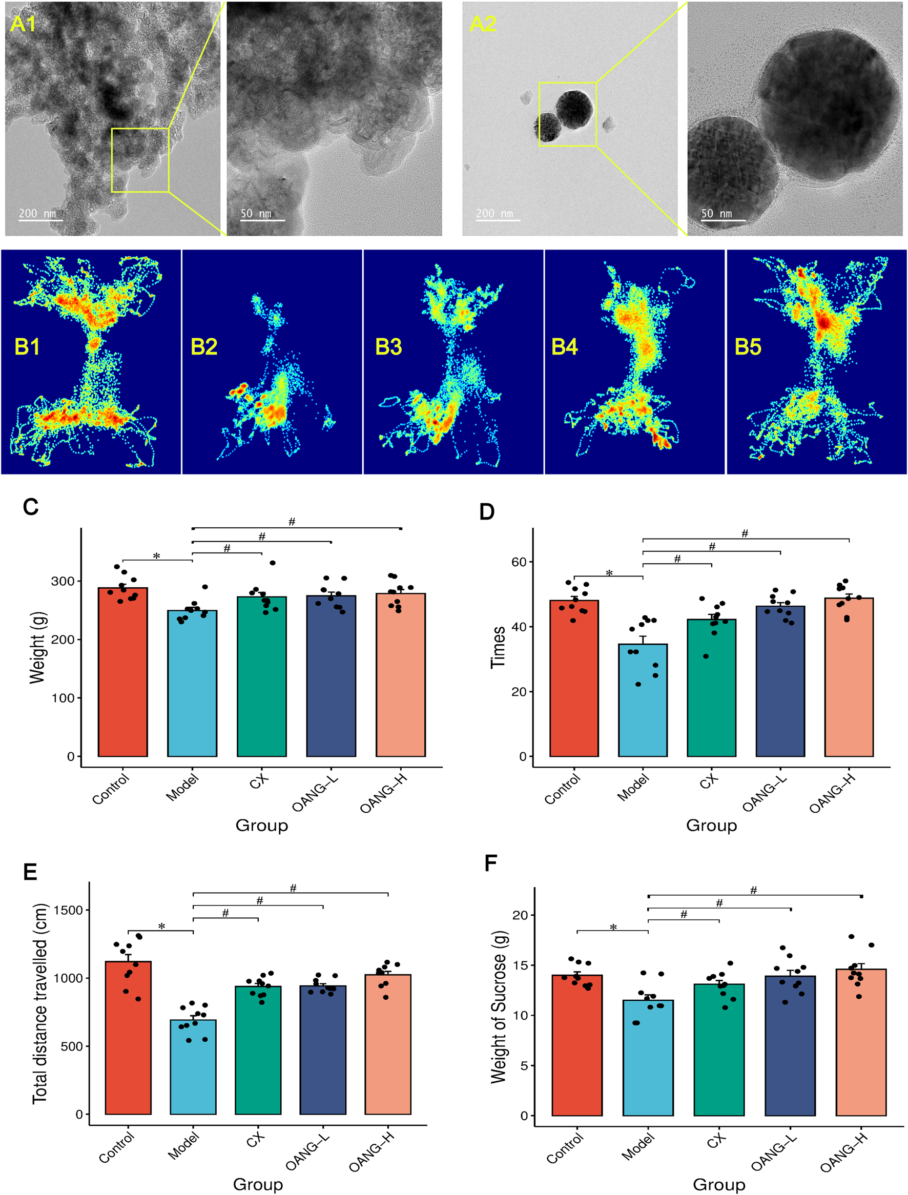 Results of the behavior test in rats (n = 10/group). (A) TEM results (A1: OA suspension in gel; A2: OANG); (B) Shuttle track of rats (1: Control, 2: Model, 3: CX, 4: OANG-L, and 5: OANG-H groups); (C) Body weight of rats; (D) Analysis of the box shuttle test results; (E) Total distance travelled test; (F) Results of sucrose preference tests. Comparison with the control group, *P < 0.05; compared with the model group, #P < 0.05.