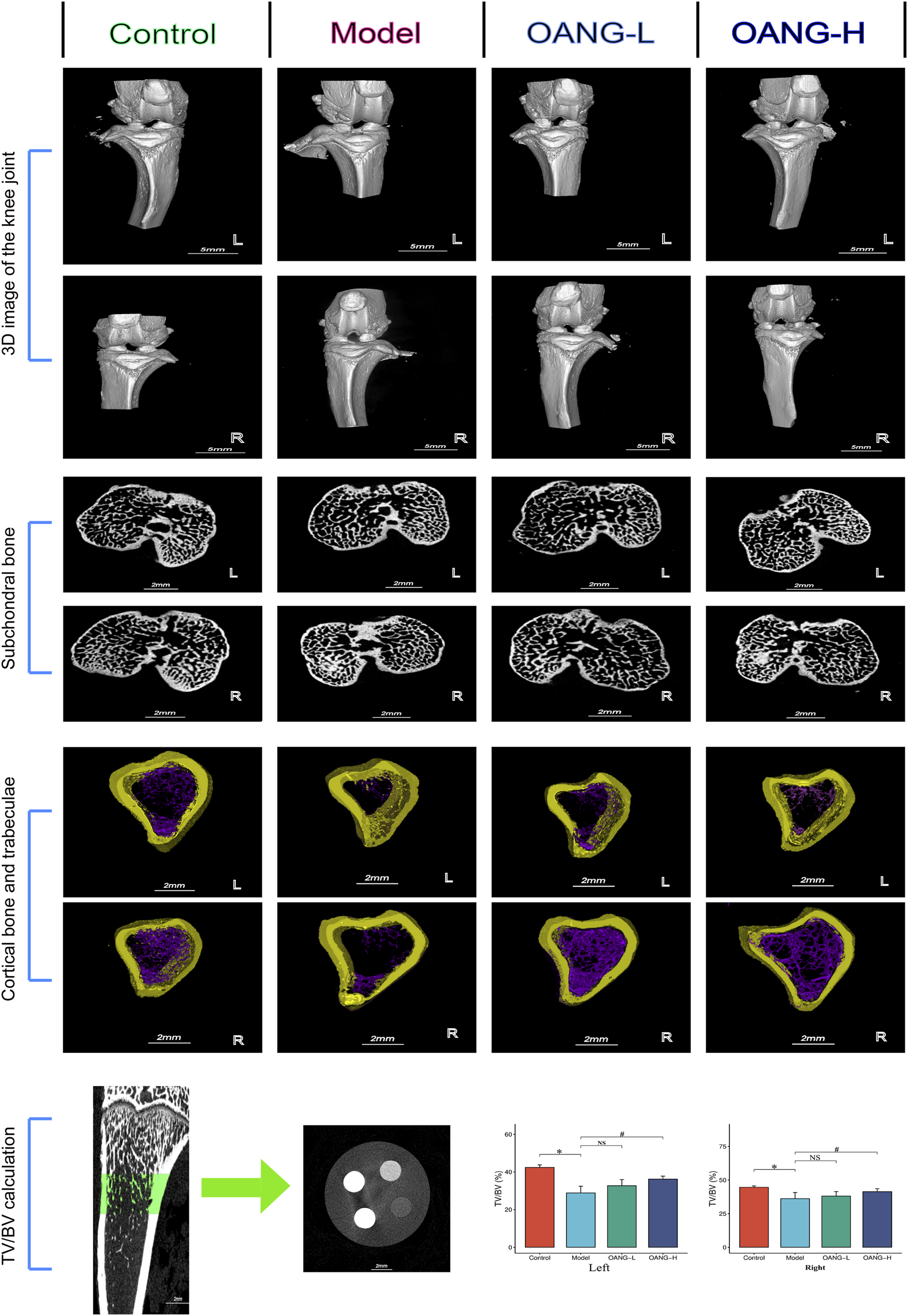 Micro-CT 3D reconstruction of the knee joint revealed decreased subchondral bone porosity in the Model group, indicative of osteosclerosis. OANG treatment reduced cartilage damage and increased porosity (Figures 2, 3D structure). The joint space was larger in the modeled left knee than in the right knee, but after OANG administration, porosity between the two knees became comparable, suggesting improved joint integrity.