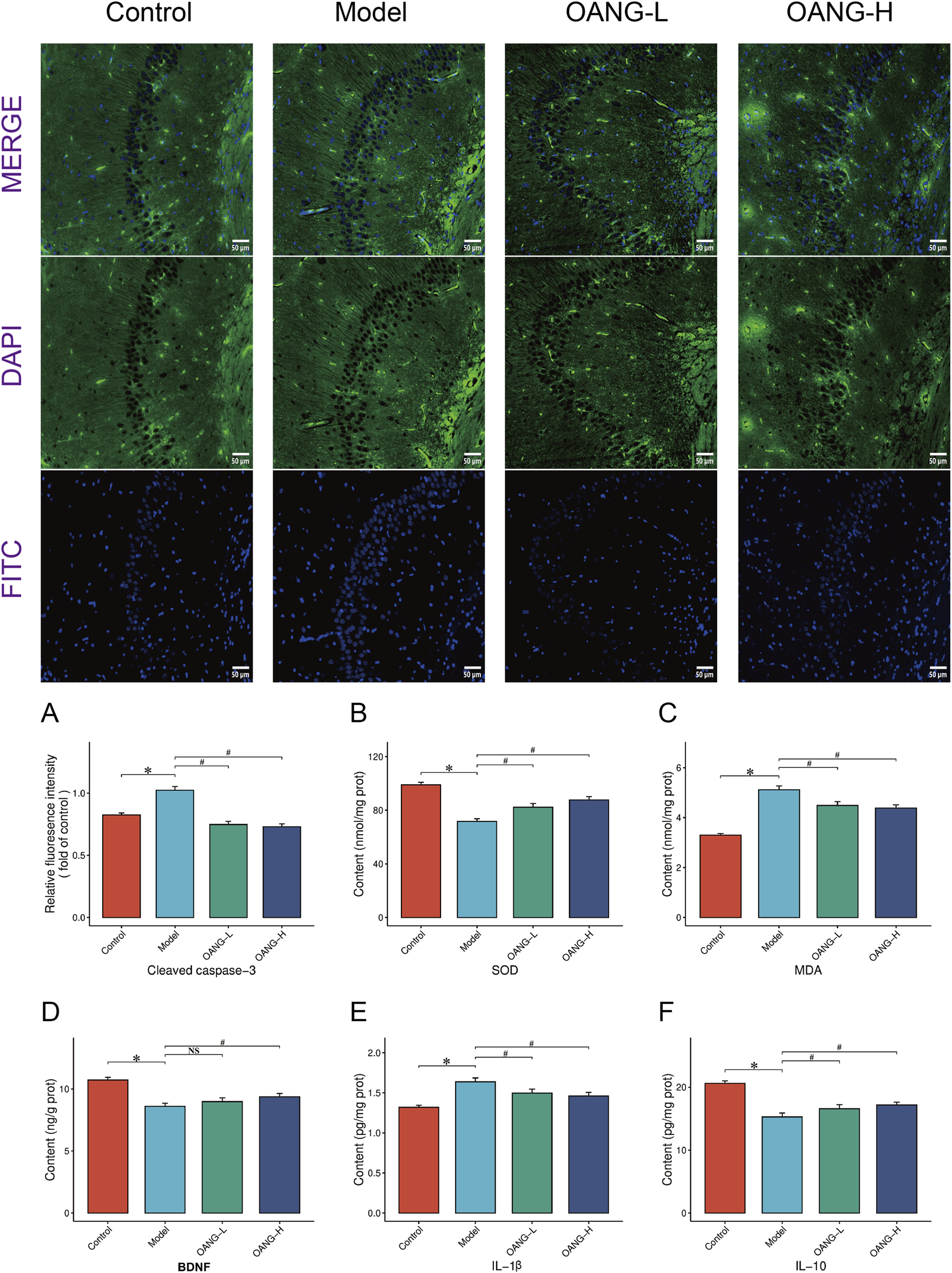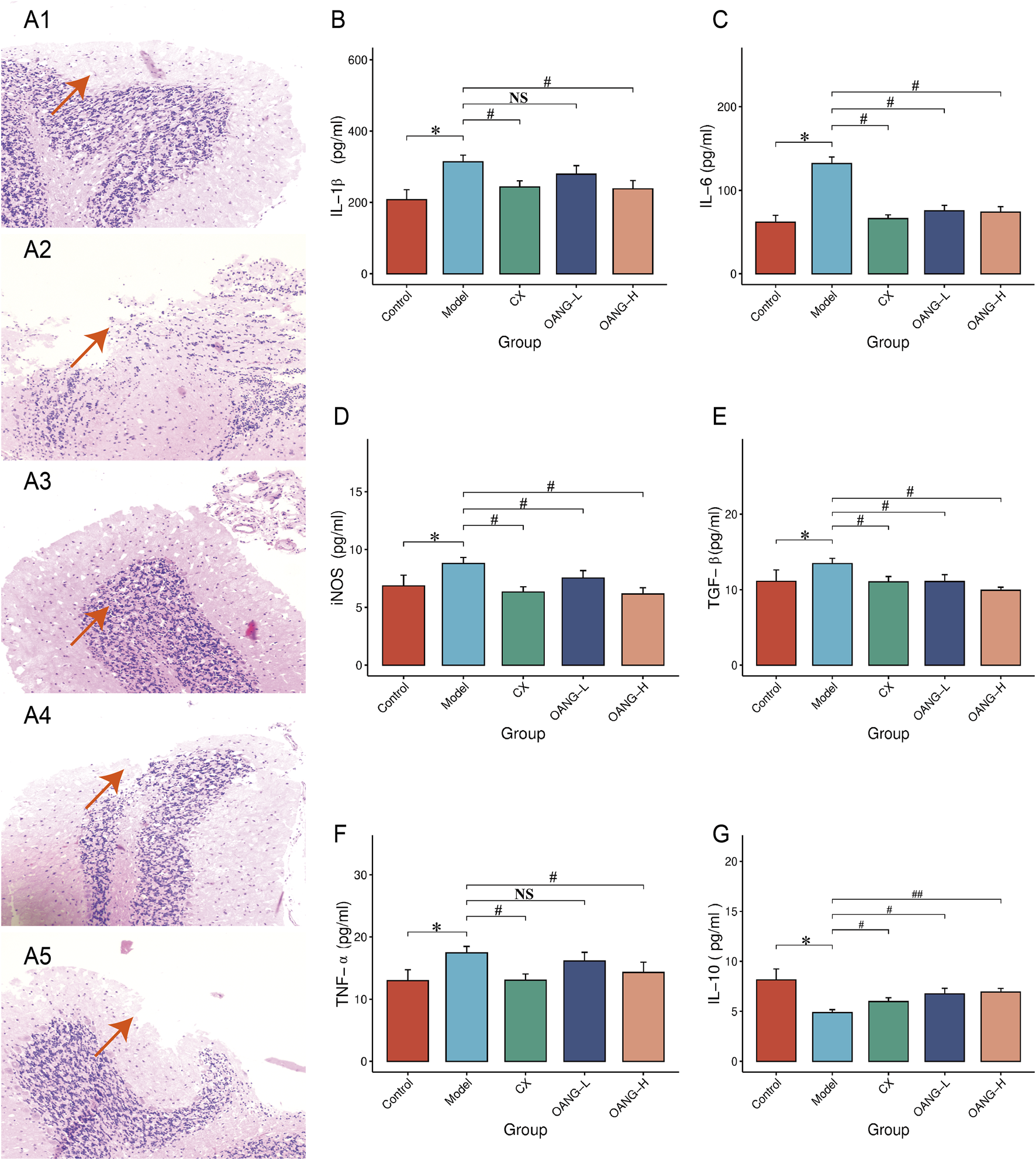 Levels of IL-1β, IL-6, iNOS, TGF-β, and TNF-α were significantly elevated in the Model group (P < 0.05, Figures 4B–F). OANG-H significantly reduced all these markers (P < 0.05). OANG-L significantly decreased IL-6, iNOS, and TGF-β (P < 0.05), but not IL-1β or TNF-α. The CX group also showed significant reductions in all five markers (P < 0.05). IL-10 was significantly decreased in the Model group (P < 0.05, Figure 4G), and all treatment groups significantly increased its level, with OANG-H showing the most pronounced effect (P < 0.01).
