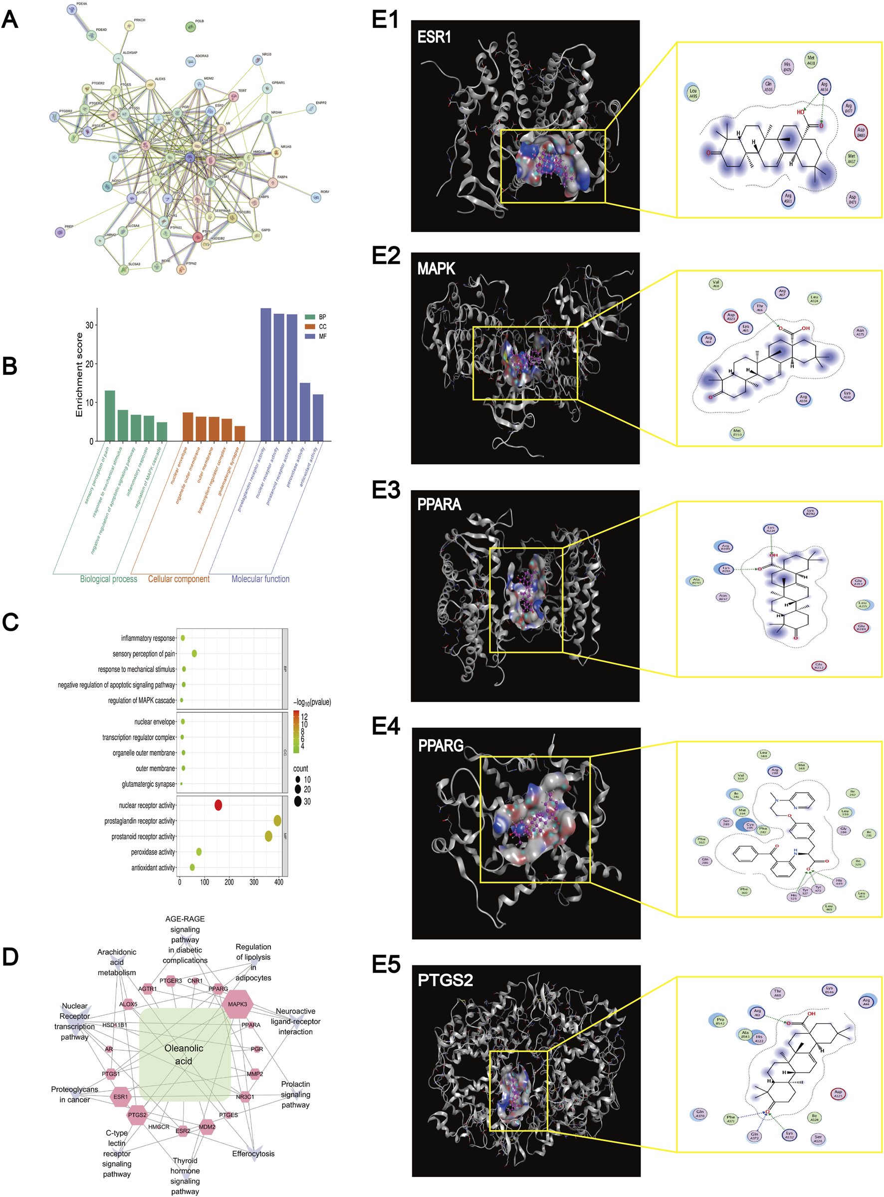 Network pharmacology analysis and Molecular docking results. (A) Results of the PPI network analysis of genes related to Oleanolic Acid treatment for osteoarthritis. (B) KEGG enrichment results of genes and pathways associated with Oleanolic Acid treatment for osteoarthritis. (C) Bubble chart of GO (Gene Ontology) analysis for genes and pathways related to Oleanolic Acid treatment for osteoarthritis (The larger the bubble, the higher the degree of relevance/association). (D) Network diagram of Oleanolic Acid, gene targets, and pathways (The larger the label, the higher the degree of relevance/association). (E) Molecular docking results for ESR1 (protein 9BQE), MAPK (protein 2ZOQ), PPARA (protein 3ET1), PPARG (protein 9CK0) and PTGS2 (protein 5F19).