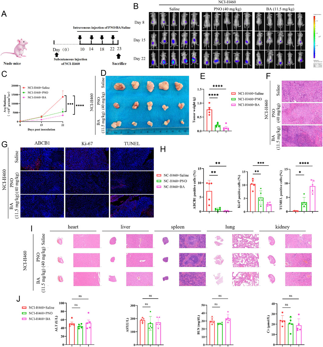 Figure 5. Borneol acetate inhibits NCI-H460 tumor growth in vivo. (A) Experimental schema: Nude mice received subcutaneous injections of 2 × 106 NCI-H460-luciferase cells. Vehicle, PNO, or BA were administered via tail vein. Tumor progression was monitored by bioluminescence imaging (BLI); tumors and organs were harvested terminally. (B) BLI pseudocolor images on days 8, 15, and 22. (C) Quantified fluorescence intensity. Data represent mean ± SD (*p < 0.001, p < 0.0001). (D) Excised tumors. Reduced BA group volume demonstrates tumor suppression. (E) Tumor weight quantification (p < 0.0001). (F) H&E-stained tumor sections. (G) Immunofluorescence staining of tumor sections: ABCB1 (blue, resistance marker), Ki67 (green, proliferation marker), TUNEL (red, apoptosis marker). Scale bar: 50 µm. (H) Quantified immunofluorescence intensity. Data represent mean ± SD (**p < 0.01, ***p < 0.001, ****p < 0.0001). (I) H&E staining of liver, spleen, lung, and kidney sections. (J) Liver/kidney function indices (ns p > 0.05).