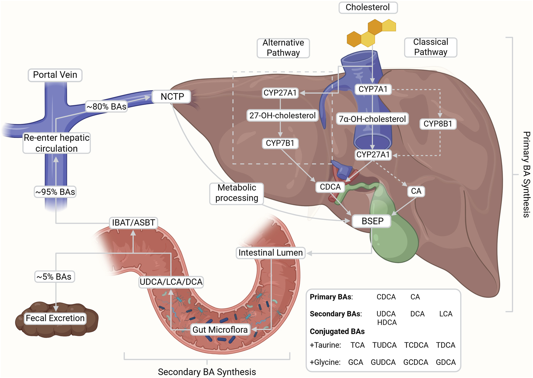 De novo synthesis, enterohepatic circulation, and microbial transformation of bile acids (BAs). Primary BAs, cholic acid (CA) and chenodeoxycholic acid (CDCA), are synthesized from cholesterol via the classical (CYP7A1-initiated) and alternative (CYP27A1-initiated) pathways in the liver. Upon conjugation with glycine or taurine, BAs are secreted into the intestine where they facilitate lipid digestion and are subsequently reabsorbed into portal circulation (∼95%) via the ileal bile acid transporter (IBAT/ASBT) and into the hepatocytes via sodium taurocholate co-transporting polypeptide (NTCP). After metabolic processing, BAs are reintroduced into the bile via bile salt export pumps (BSEP) at the bile canaliculi. A small fraction escapes reabsorption and is modified by gut microbiota into secondary BAs (e.g., DCA, LCA, UDCA), contributing to the recycling and regulatory feedback of the enterohepatic system. This figure was created with BioRender.com.