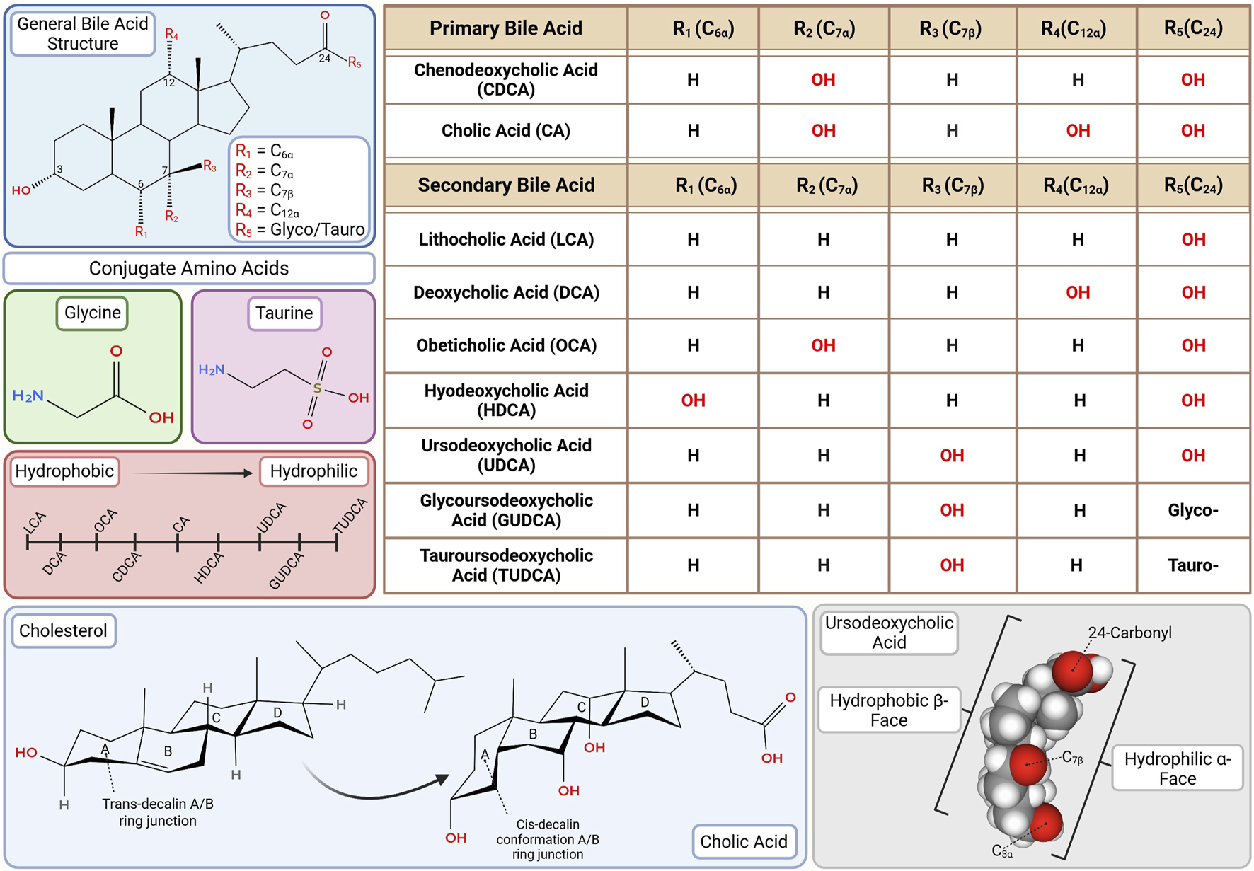 Bile acid (BA) structure and hydrophilicity. The number, degree, position and stereochemistry of hydroxyl groups on the steroid nucleus (especially at C3, C6, C7, and C12) determine hydrophilic-hydrophobic balance, influencing toxicity and receptor binding. Glycine or taurine conjugation further moderates solubility, enterohepatic circulation, kinetics and receptor binding affinity. This diversity underpins the rationale for selective therapeutic application ranging from FXR agonist-based interventions with OCA to neuroprotective strategies using GUDCA and TUDCA. This figure was created in BioRender.com. The chemical structures were created in app.molview.com.