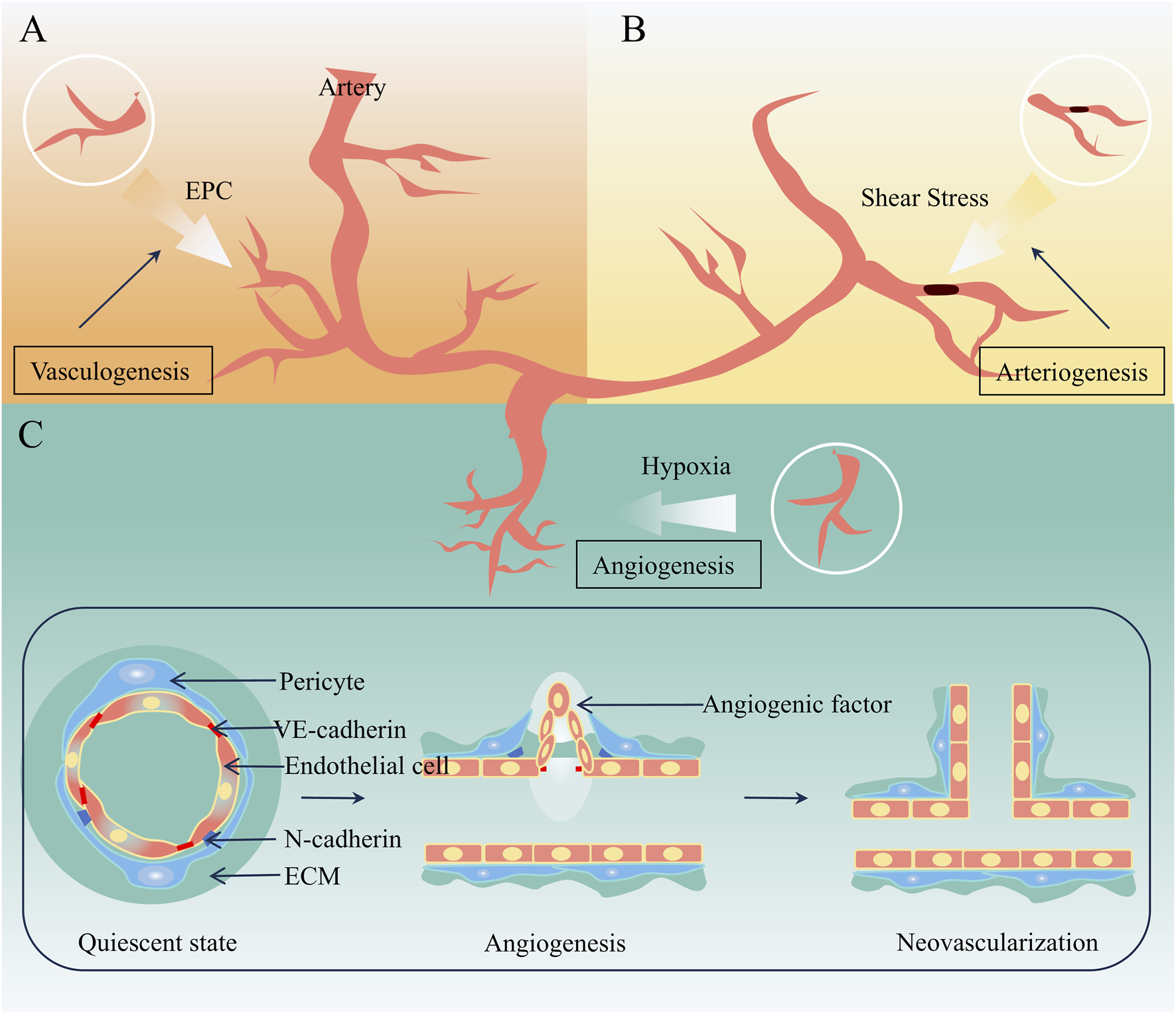 Mechanisms related to neovascularization. (A) Vasculogenesis (B) Arteriogenesis (C) Angiogenesis.