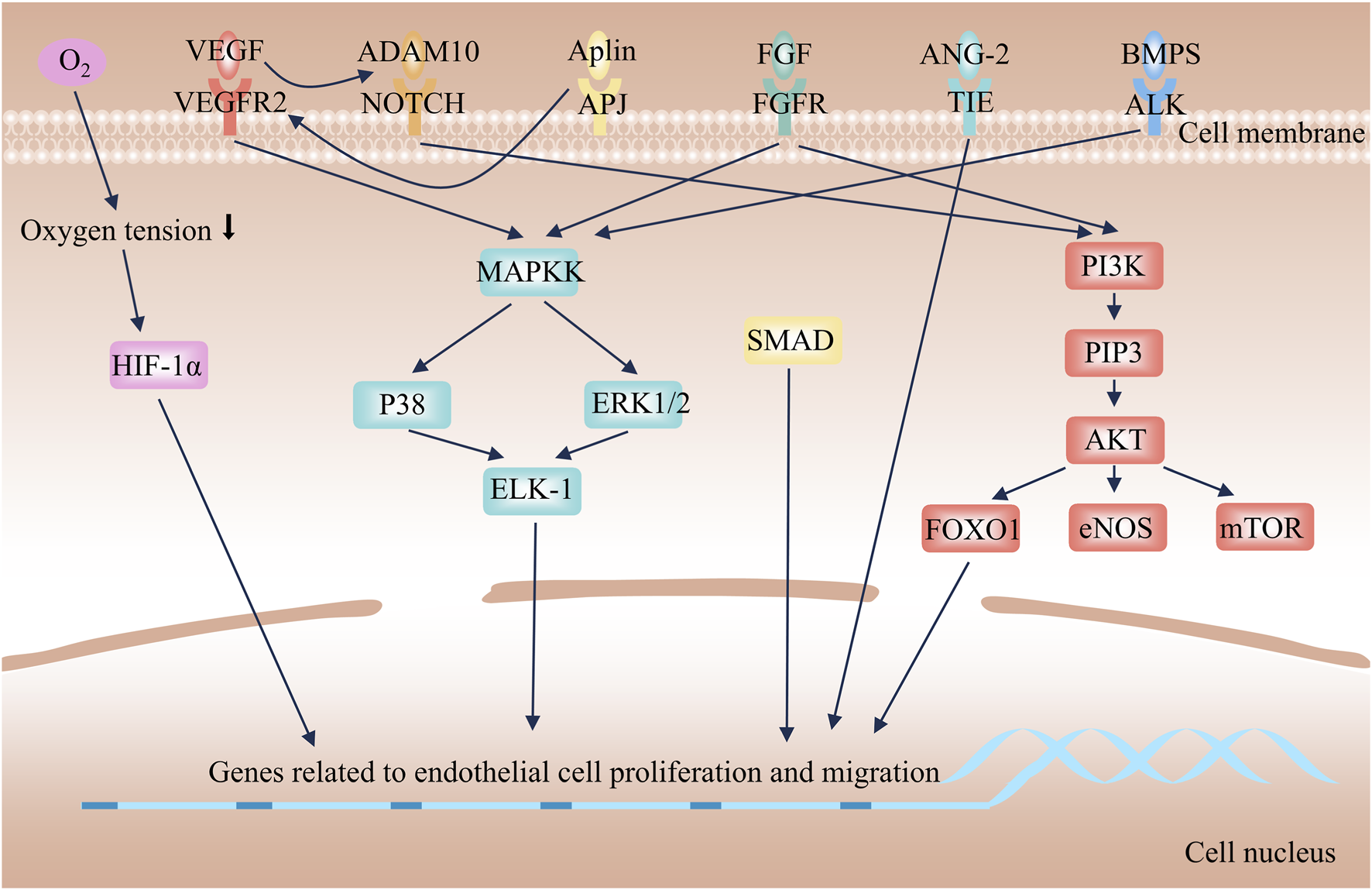 Angiogenic factors are upregulated in response to stimuli such as hypoxia, activating downstream angiogenesis signaling pathways to promote endothelial cell sprouting, migration, and lumen formation. Hypoxia-inducible factors (HIFs) are a class of transcription factors activated under hypoxic conditions, playing a central role in hypoxic adaptation (Acuña-Pilarte and Koh, 2025). Tissue hypoxia inhibits the ubiquitin-proteasomal degradation of HIF-1α, allowing it to translocate into the nucleus, where it binds to the β subunit and recruits transcriptional coactivators. This complex then binds to hypoxia response elements on target genes, such as VEGF-A and FGF, inducing the expression of pro-angiogenic signaling molecules (Plastino et al., 2021; Basavaraju et al., 2021). Increased biosynthesis of pro-angiogenic signals induces matrix metalloproteinases (MMPs) to degrade ECM components. This process leads to the detachment of pericytes from the basement membrane, disruption of endothelial junctions, and increased vascular permeability, thereby creating conditions that are conducive to endothelial cell migration (Carmeliet and Jain, 2011). Individual endothelial cells, known as tip cells, undergo sprouting and migration in response to pro-angiogenic signaling molecules. The migration of tip cells relies on PI3K/Akt-eNOS-mTOR-FOXO1 axis-mediated cell proliferation and cytoskeletal remodeling (Ackah et al., 2005; Fukumura et al., 2001). Additionally, the FGF/FGFR and Apelin/APJ systems synergistically promote this process by regulating energy metabolism and directional polarity (Vimalraj, 2022; Wagenaar and Moll, 2025). Concurrently, BMP2 enhances sprouting through the activation of the PI3K/Akt and MEK/ERK pathways (Cai et al., 2012; Goumans et al., 2009; Chen et al., 2018). Notch signaling further activates the PI3K/Akt pathway to sustain the survival and proliferation of endothelial cells (Gude et al., 2008; Meurette et al., 2009). The aforementioned signaling pathways collectively synergize to promote the sprouting and migration of endothelial cells. Following the tip cells are endothelial cells called stalk cells, which are responsible for lumen elongation and pericyte recruitment (ávila-Gálvez et al., 2025). After branch fusion, endothelial cells in the new blood vessels revert to a quiescent state, reorganize cellular junctions, promote pericyte maturation, deposit the basement membrane, and maintain the balance between pro-angiogenic and anti-angiogenic factors (Liu et al., 2023).