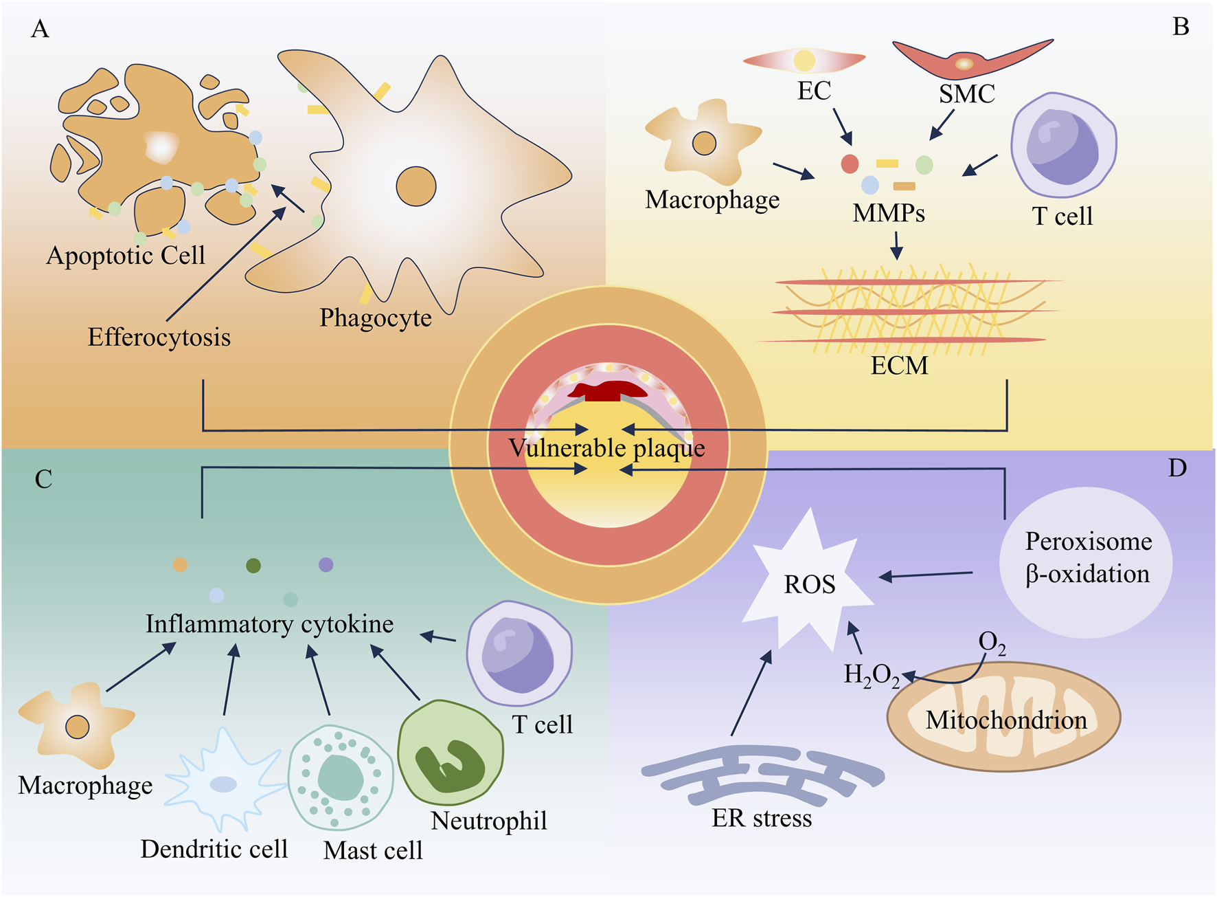 Mechanism of vulnerable plaque formation. (A) Apoptosis (B) Extracellular matrix remodeling (C) Inflammatory response (D) Oxidative stress.