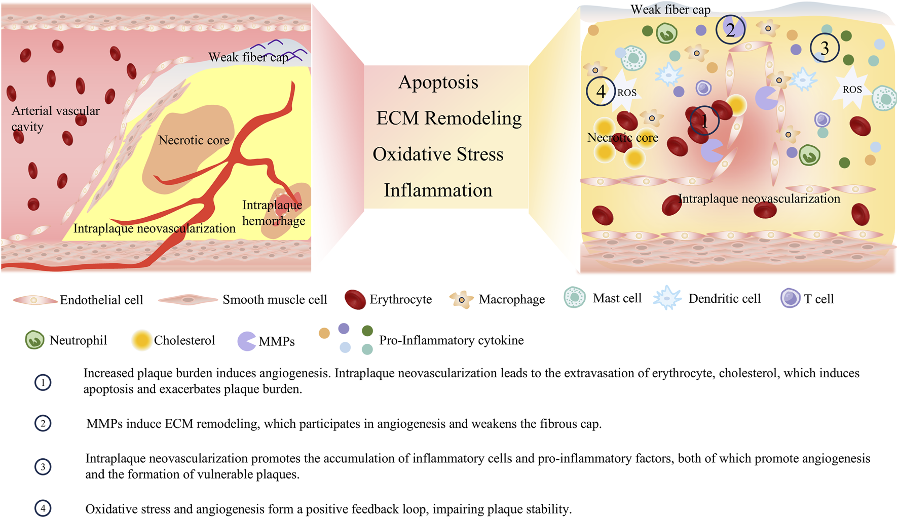 Intraplaque angiogenesis is a consequence of the hypoxic environment in the hyperplastic intima induced by the progression of AS. It involves a series of complex processes, including endothelial cell sprouting, proliferation, migration, as well as lumen formation and maturation, among which the activation of VEGF-related pro-angiogenic signaling plays a dominant role. While intraplaque neovessels compensate for the loss of oxygen and nutrients to the intima, these neovessels exhibit loose endothelial junctions and insufficient pericyte coverage, making them highly prone to leakage. This leakage creates conditions for the entry of cholesterol, inflammatory cells, red blood cells, ECM, and other atherogenic molecules into the plaque. In turn, this further activates phenotypes associated with vulnerable plaque formation, such as cell apoptosis, ECM remodeling, inflammatory response, and oxidative stress.