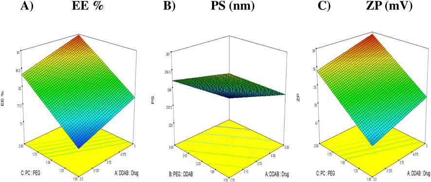 Figure 1. 3D response plots illustrating the effect of DDAB: drug ratio (factor X1), PEG: DDAB ratio (factor X2) and PC: PEG ratio (factor X3) on entrapment efficiency (%EE), particle size (PS), and zeta potential (ZP). (A) %EE. (B) PS (nm). (C) ZP (mV).