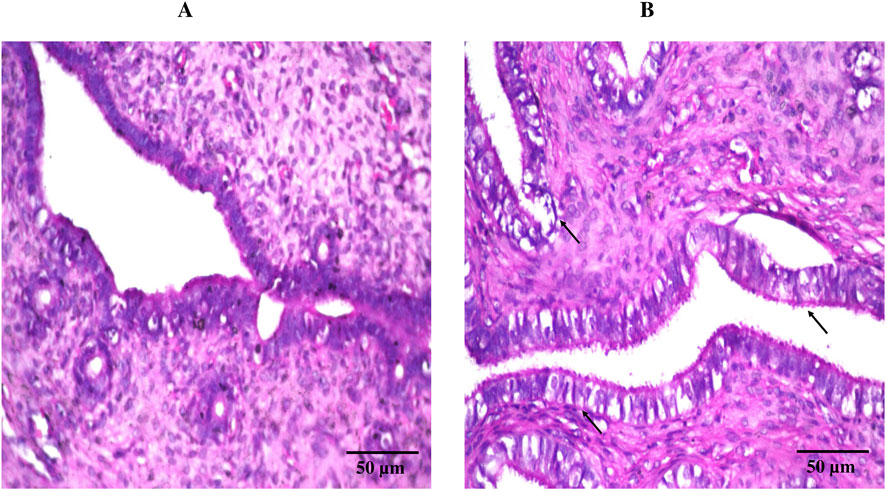 To assess the local safety and mucosal tolerance of DHCPP gel following vaginal application, a histopathological study was performed using female albino rabbits. The animals were randomly divided into two groups (n = 3 each): a negative control group that received no treatment and a test group treated with the optimized DHCPP gel. The DHCPP gel (equivalent to 1000 µg FTN) was administered intra-vaginally twice daily for 1 week using a soft polyethylene applicator. After treatment termination, the animals were anesthetized and subsequently euthanized. Vaginal tissue specimens were excised and immediately fixed in 10% neutral buffered formalin for 24 h to preserve structural integrity. The samples were then sequentially dehydrated using graded alcohol concentrations (methanol, ethanol, and absolute ethanol), cleared with xylene, and embedded in paraffin wax at 56 °C to obtain tissue blocks. Thin sections (approximately 4 µm) were cut using a rotary microtome, mounted on glass slides, deparaffinized, and stained with hematoxylin and eosin (H&E) following standard histological protocols (Nemr et al., 2025; Abdelbary and AbouGhaly, 2015). The stained sections were examined under a light microscope (CX21, Olympus, Tokyo, Japan) to detect any signs of epithelial damage, edema, inflammatory infiltration, or other histological abnormalities. Comparison with control tissues confirmed the biocompatibility and non-irritant nature of the developed formulation toward the vaginal mucosa (Helal et al., 2025).