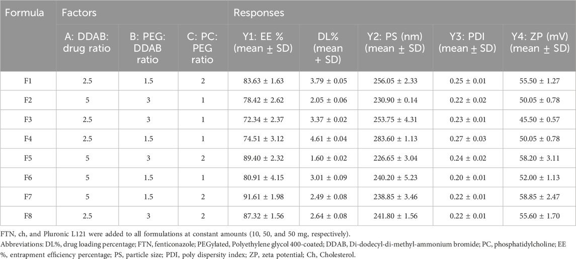 To methodically evaluate how different formulation parameters affect the physicochemical behavior of the prepared FTN–loaded DHCPPs, a full 23 factorial experimental design was employed utilizing Design-Expert® software (version 13; Stat-Ease Inc., Minneapolis, MN, USA).This statistical tool was employed for its efficiency in simultaneously evaluating multiple factors and their possible interactions while minimizing experimental runs (Ahmed et al., 2025d). Based on preliminary trials, three key formulation parameters were chosen as independent variables: the ratio of DDAB to drug (Factor A), the PEG-to-DDAB ratio (Factor B), and the PC-to-PEG ratio (Factor C). Each parameter was examined at two distinct levels to provide a comprehensive understanding of its impact on formulation performance. The evaluated dependent variables comprised encapsulation efficiency (EE%; Y1), particle size (PS; Y2), poly-dispersity index (PDI; Y3), and zeta potential (ZP; Y4), which collectively serve as key determinants (pre-optimization measurements) of the formulation’s drug encapsulation capability, nanoscale uniformity, and overall colloidal stability. This factorial approach enabled the identification of significant main effects, facilitating the optimization of formulation composition toward achieving high EE%, nanoscale particle size, and stable charge characteristics (El Hassab et al., 2025; Ahmed et al., 2025e). A detailed overview of the experimental layout, outlining the factor levels alongside the corresponding measured responses, is provided in Table 1, whereas Table 2 summarizes the obtained results for all formulated batches.