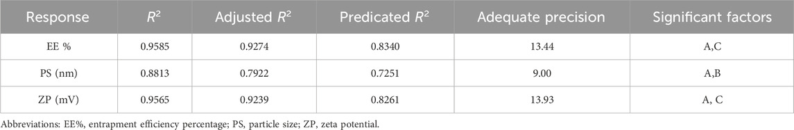 To achieve a precise optimization of DHCPPs, a 23 factorial design was systematically employed. This design enabled an in-depth investigation of the critical formulation factors influencing the nanocarrier’s physicochemical properties and performance. The selected independent variables were: the DDAB: drug ratio (Factor A), the PEG: DDAB ratio (Factor B), and the PC: PEG ratio (Factor C). Using the factorial matrix, eight experimental runs were generated to evaluate the effects of the studied variables while minimizing experimental workload (Zhang et al., 2010). The responses selected as critical quality attributes included EE%, PDI, ZP and PS. These parameters collectively reflect encapsulation capability, nanoscale uniformity, and electrostatic stability, which are essential for ensuring efficient vaginal delivery. The experimental data were analyzed using Design-Expert® software. Regression modeling and response surface methodology (RSM) were applied to derive polynomial equations, predict optimal conditions, and visualize the influence of each factor on the measured responses (Habib et al., 2018). Statistical validation confirmed the reliability and accuracy of the developed models, as indicated by high coefficients of determination (R2) and minimal differences (<0.2) between adjusted and predicted R2 values. Furthermore, adequate precision values for all responses exceeded the recommended threshold of 4, signifying strong model predictability and a favorable signal-to-noise ratio (Younes et al., 2024; Younes et al., 2025) (Table 3).