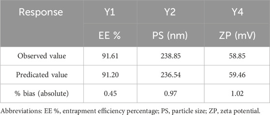 FTN-loaded DHCPP formulations were systematically optimized using Design-Expert® software (version 13, Stat-Ease Inc., Minneapolis, USA) to determine the formulation with the most favorable physicochemical characteristics. The optimization parameters were established to achieve maximum encapsulation efficiency (EE%; Y1) and high absolute zeta potential (ZP; Y4), while minimizing particle size (PS; Y2) and keeping the polydispersity index (PDI; Y3) within a suitable range to ensure uniform nanoscale distribution and stable colloidal behavior (Ahmed et al., 2024b). Analysis of variance (ANOVA) was employed to statistically examine the significance of the model terms and the interactions between formulation variables. A numerical multi-response optimization approach was then applied, where each response was transformed into an individual desirability function ranging from 0 (least desirable) to 1 (most desirable) (Ahmed et al., 2025e). These individual functions were subsequently integrated into a composite desirability index, allowing simultaneous consideration of all targeted parameters. The formulation displaying the highest overall desirability value was identified as the optimized system and selected for confirmatory evaluation (Albash et al., 2025b). The close agreement between predicted and experimental values, expressed as a low percentage deviation, verified the accuracy, stability, and predictive capability of the optimization model was determined using Equation 3 (Albash et al., 2025c).