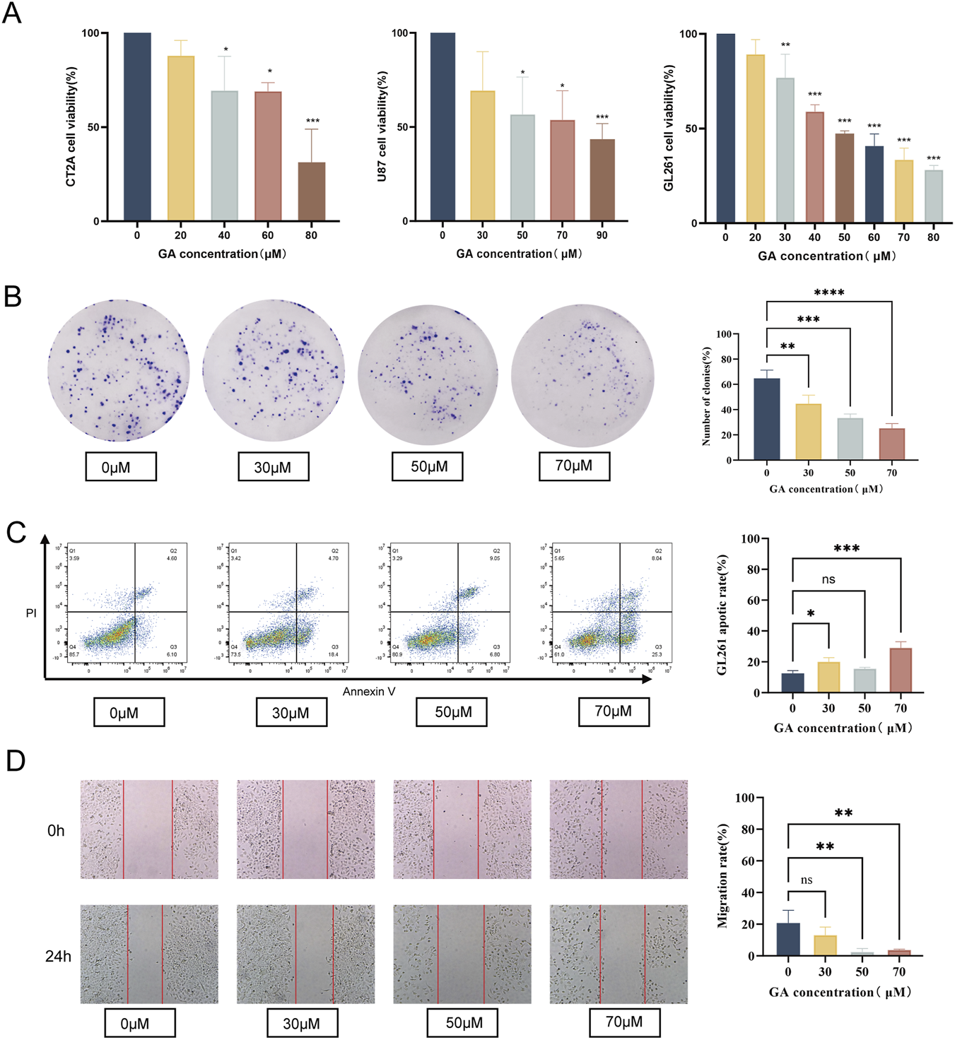 GL261 cells were seeded in 6-well plates at a density of 1 × 105 cells per well. After reaching 90% confluence, a uniform scratch was created using a sterile pipette tip, and the cells were washed twice with PBS. The cells were then treated with 30, 50, and 70 μM of GA Images of the wound area were captured at 0 and 24 h. The cell migration rate was calculated as follows: Migration rate (%) = [1 − (Wound area at 24 h/Wound area at 0 h)] × 100%.