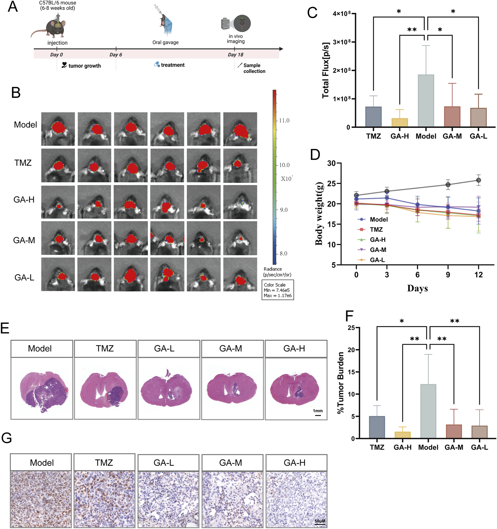 Both intracranial and subcutaneous models were treated daily via oral gavage with TMZ (35 mg/kg/day, Selleck) or GA (12.5, 25, or 50 mg/kg/day, Aladdin, Moligand™, ≥97%) for 13 days, while the control group received Carboxymethyl cellulose sodium salt solution (CMC-Na).