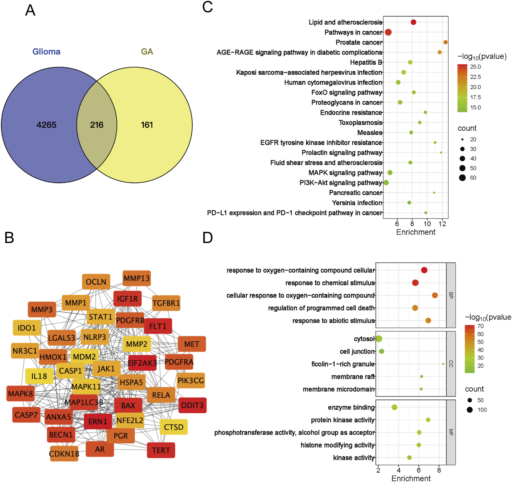Network analysis -based analysis of GA’s functional impact. (A) Venn diagram of the overlapping targets between GA and GBM. (B) Protein-protein interaction (PPI) network of the top 40 core targets from the overlapping set in (A,C) Top 20 tumor-associated pathways from the KEGG enrichment analysis. (D) Top five significantly enriched Gene Ontology (GO) terms for the overlapping targets in (A) BP, biological process; CC, cellular component; MF, molecular function. GA:18β-Glycyrrhetinic acid.