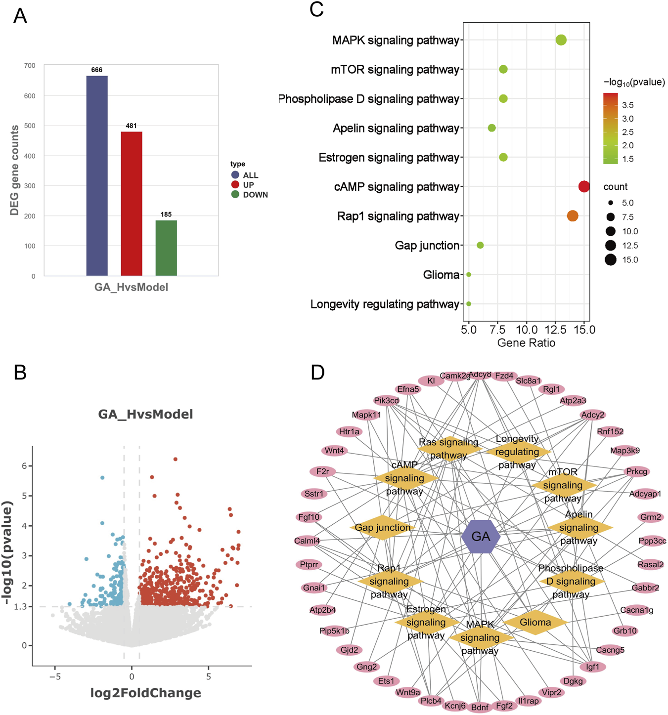 Integrative multi-omics identified GA’s functional impact. (A) Number of upregulated and downregulated genes in high-dose GA treatment groups. (B) Volcano plot of differentially expressed genes between the high-dose GA group and the model group. (C) Eleven overlapping pathways related to cell proliferation and apoptosis identified by integrating network analysis and transcriptomics. (D) Metabolite–target–pathway network of GA and GBM. GA:18β-Glycyrrhetinic acid.