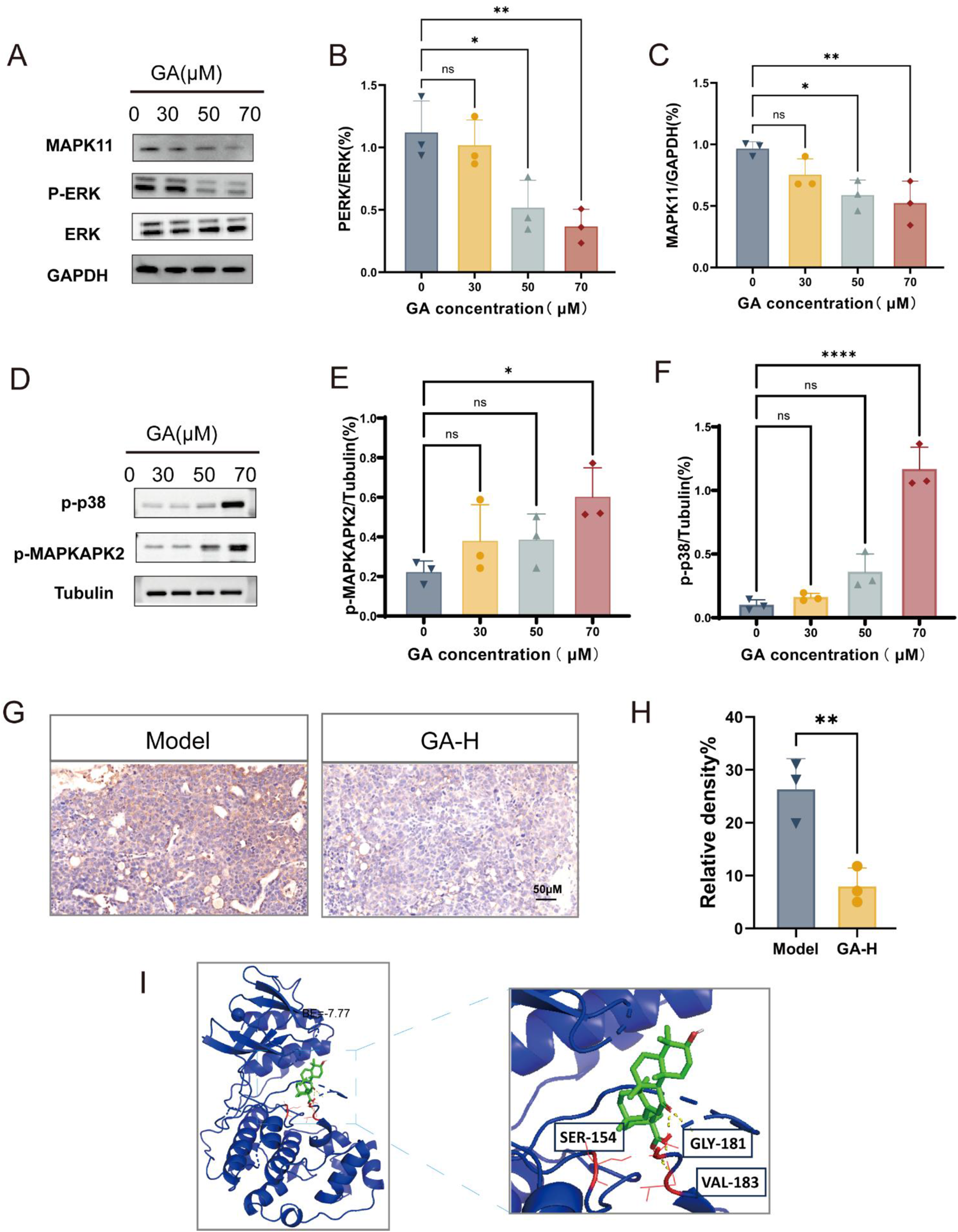 We confirmed that GA downregulated MAPK11 expression both in vivo (Figures 7G,H) and in vitro (Figures 7A,C). We further examined ERK, MAPK11 and MAPKAPK2 phosphorylation levels by Western blotting. The results showed that GA dose-dependently suppressed ERK phosphorylation in a dose-dependent manner. In contrast, a contrasting activation of the p38 pathway was observed, as evidenced by upregulated phosphorylation of both p38 and MAPKAPK2 (Figures 7A–F). The molecular docking results suggested a potentially strong interaction between GA and MAPK11 (Figure 7I).