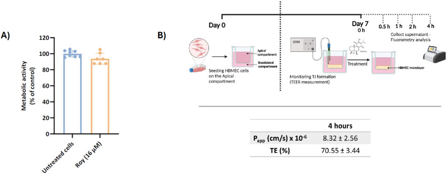 Figure 2. Assessment of Roy’s capability to cross a brain endothelial cell monolayer in vitro. (A) Effect of 16 µM Roy in the metabolic activity of HBMEC cells after a 4 h-treatment. Metabolic activity was evaluated using Alamar Blue® assay and results were expressed as percentage of control (untreated cells). (B) Scheme of the in vitro BBB model with HBMEC cells in a Transwell® system and assessment of the apparent permeability coefficient (Papp) value and transport efficiency (TE) of Roy-Bodipy (16 µM) using this BBB model. Data are presented as mean ± SD and it is representative of at least three independent experiments. Scheme was generated using objects from Biorender.