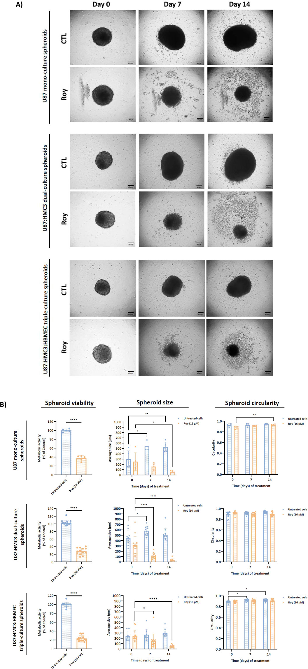 Figure 3. Effect of treatment with Roy on U87 mono-culture spheroids, U87:HMC3 dual-culture spheroids, and U87:HMC3:HBMEC triple-culture spheroids. After 72 h, 3D spheroids were treated with 16 µM of Roy and further incubated for 14 days, with media being refreshed every 2–3 days. (A) Representative images of treated spheroids at days 0, 7, and 14 are displayed. Images were obtained by an inverted microscope with a total ampliation of 40X. (B) The mean spheroid size and circularity progression were measured on days 0, 7, and 14. Metabolic activity was evaluated at day 14 and expressed as percentage of control. Untreated spheroids were considered controls. Asterisks (*p < 0.05, **p < 0.01, and ****p < 0.0001) represent the values that significantly differ from the control condition. Statistical analyses were performed to compare each treated condition with the corresponding control.