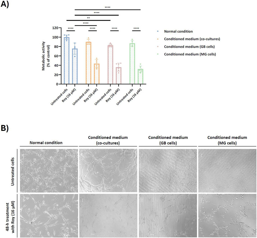Figure 4. Effect of conditioned medium on the cytotoxic/antiproliferative activity of Roy in glioblastoma cells. U87 cells were pre-incubated for 1 h either with secretome from untreated cells, namely co-cultures (U87 and HMC3 cells), culture of U87 cells, or culture of HMC3 cells. After, cells were treated with 16 µM of Roy for 48 h. (A) Metabolic activity was assessed through Alamar blue® assay and was expressed as percentage of control (untreated cells in the normal condition). Asterisks (**p < 0.01, and ****p < 0.0001) represent the values that significantly differ from the other conditions. Statistical analyses were performed to compare each treated condition with the untreated cells in the normal condition. Data are presented as mean ± SD and it is representative of at least three independent experiments. (B) Representative images of treated cells after 48 h are displayed. Images were obtained by an inverted microscope with a total ampliation of 40X.