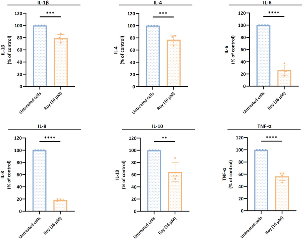 Figure 5. Assessment of cytokines levels released by glioblastoma cells after treatment with Roy. U87 cells were treated with 16 µM of Roy and incubated for 48 h. After incubation, the secretome of treated and untreated cells was collected and analyzed by multiplexed Luminex® immunoassay. The expression of IL-1β, IL-4, IL-6, IL-8, IL-10, and TNF-α was normalized to CTL (untreated cells) and expressed as percentage of the control. Asterisks (**p < 0.01, ***p < 0.001, and ****p < 0.0001) represent the values that significantly differ from the control (untreated cells). Statistical analyses were performed to compare each treated condition with the corresponding control. Data are presented as mean ± SD and it is representative of at least four independent experiments.
