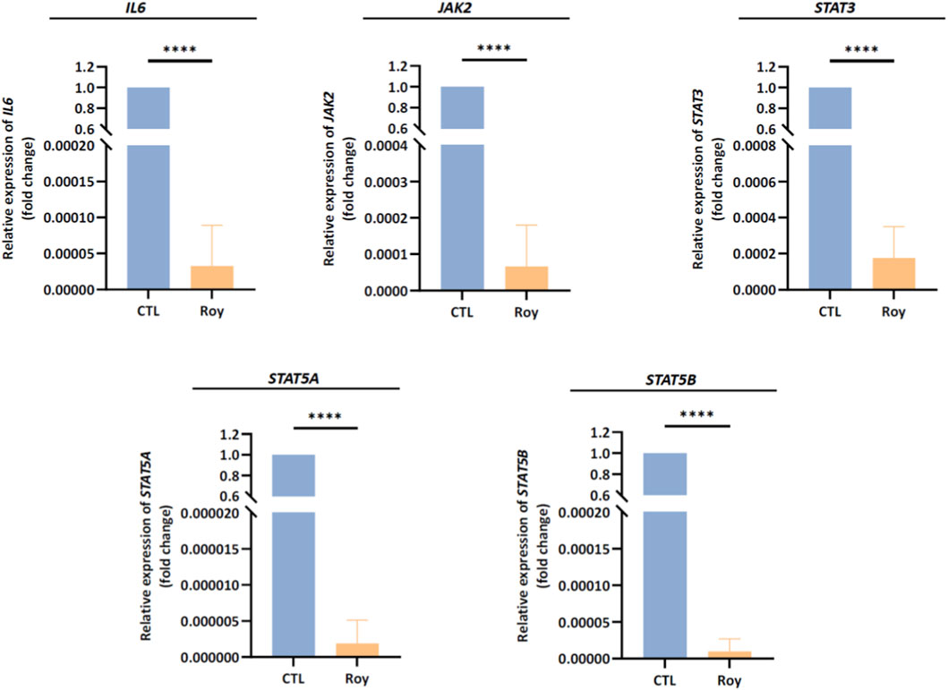 Figure 6. Assessment of IL6, JAK2, STAT3, STAT5A, and STAT5B mRNA levels in U87 cells after treatment with Roy. Cells were treated with 16 µM of Roy and further incubated for 48 h. After incubation, the relative expression of IL6, JAK2, STAT3, STAT5A, and STAT5B mRNA levels was assessed by qRT-PCR, and the results were normalized to GAPDH expression. Asterisks (****p < 0.0001) represent the values that significantly differ from the control (untreated cells). Statistical analyses were performed to compare each treated condition with the corresponding control. Data are presented as mean ± SD and it is representative of three independent experiments.