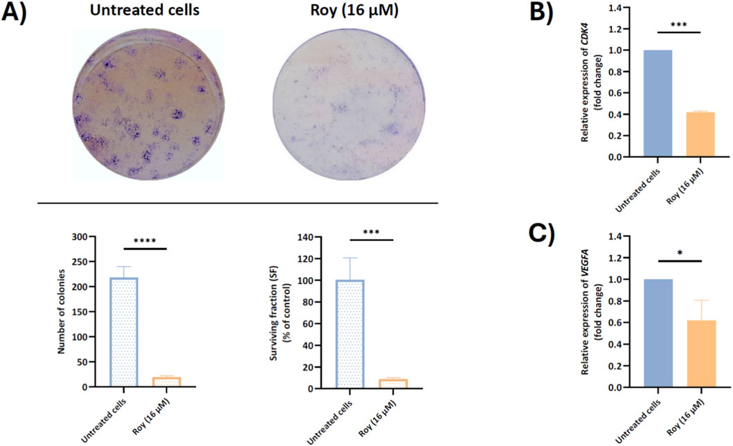 Figure 7. Assessment of colony formation (A) and CDK4 (B) and VEGFA (C) mRNA levels in U87 cells, after treatment with Roy. Cells were treated with 16 µM of Roy. (A) After a 14-day incubation, colony formation was assessed by microscopy and the number of colonies and surviving fraction was quantified using FIJI/imagej. (B,C) After 48 h, the relative expression of CDK4 and VEGFA mRNA levels was assessed by qRT-PCR, and the results normalized to GAPDH expression. Asterisks (*p < 0.05, ***p < 0.001, and ****p < 0.0001) represent the values that significantly differ from the control (untreated cells). Statistical analyses were performed to compare each treated condition with the corresponding control. Data are presented as mean ± SD and it is representative of at least three independent experiments.