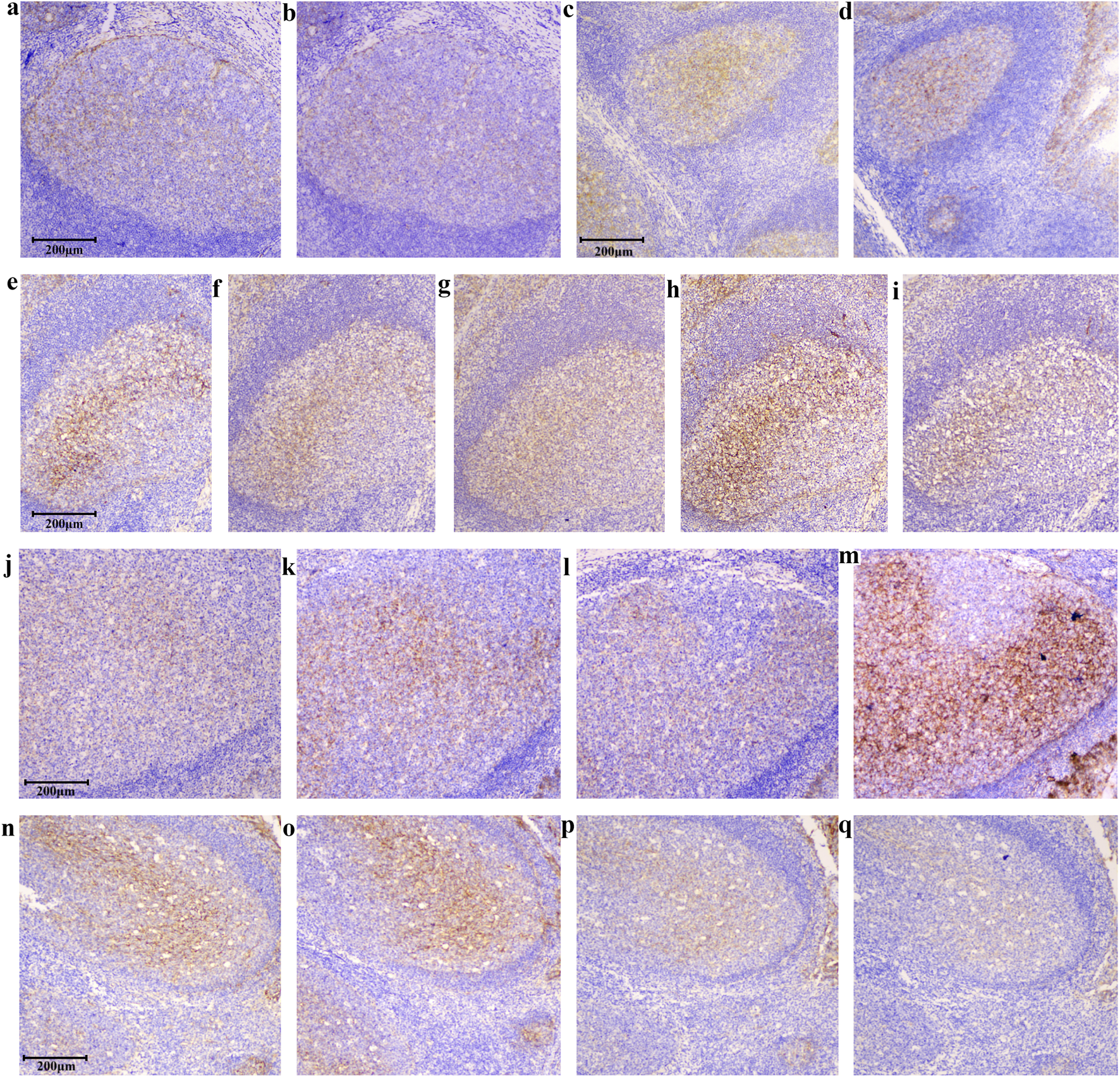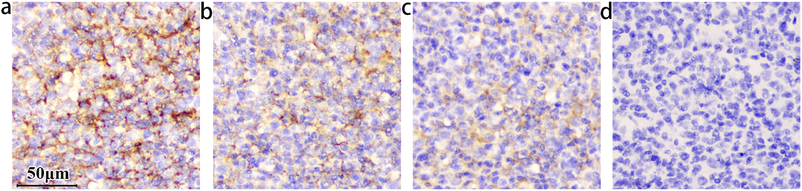 The staining intensity within the germinal center decreased as the concentrations of B7-H3 protein increased. The concentration of the B7-H3(36H7) antibody is 1.0 μg/mL. All of the slides Staining by BOND III. (a) No B7-H3 protein added, (b) The concentration of B7-H3 protein is 0.05 μg/mL, (c) 0.1 μg/mL, (d) 0.5 μg/mL. When the concentration is increased to (d) 0.5 μg/mL, the antibody binding site is occupied by the B7-H3 protein, which loses the ability to detect the sample. The results confirming the binding specificity of the antibody B7-H3(36H7). scale bar 50 μm. Original magnification, ×400.