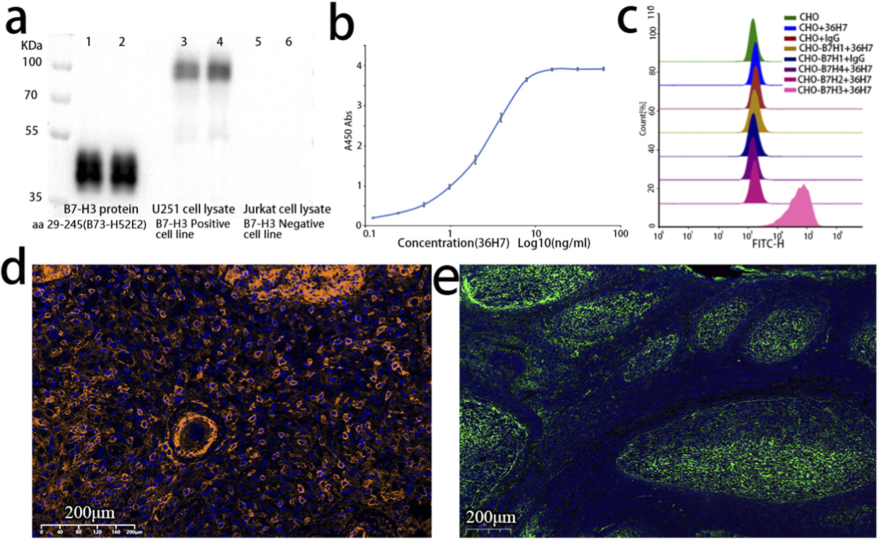 The B7-H3 (36H7) antibody consistently exhibits specific recognition of the B7-H3 antigen across multiple assay platforms. (a) Western blot (WB) result of B7-H3 antibody. lane 1 and 2: B7-H3 protein (B73-H52E2 29–245); lane 3 and 4: Lysates of U251 cells; lane 5 and 6: Lysates of Jurkat cells. The 36H7 antibody clone demonstrated specific immunoreactivity with U251 positive control cells, while showing no detectable cross-reactivity with negative cellular components. (b) The results of ELISA showed that the B7-H3(36H7) antibody had high sensitivity, and the concentration for 50% of maximal effect (EC50) was 2.474 ng/mL. (c) The B7-H3(36H7) antibody does not bind to other proteins within the same family (B7-H1, B7-H2, B7-H4), only binding to B7-H3 protein. (d) Fluorescence detection in glioma paraffin-embedded sections using the B7-H3 (36H7) antibody paired with HRP-conjugated goat anti-rabbit secondary antibody (G2-1234) and TSA570 dye. Clear membrane staining is observed. (e) Immunofluorescence detection in tonsil paraffin-embedded sections using the B7-H3 (36H7) antibody paired with Alexa Fluor 647-conjugated goat anti-rabbit secondary antibody, showing specific recognition in the germinal centers.