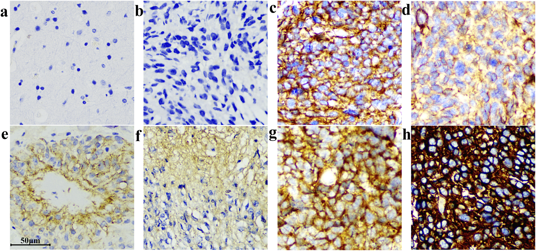 SUPPLEMENTARY FIGURE S5B7-H3 protein was detected in all eight tumor samples. The B7-H3 protein is expressed in a variety of tumor tissues, and the B7-H3 (36H7) antibody can be effectively recognized on slides of other tumor types. (a) gastric adenocarcinoma. (b) lung adenocarcinoma. (c) hepatocellular carcinoma. (d) breast - non-special invasive breast cancer. (e) cervix - squamous cell carcinoma. (f) prostate – adenocarcinoma. (g) kidney - clear cell carcinoma. (h) glioma. scale bar 50 μm. Original magnification, ×400.