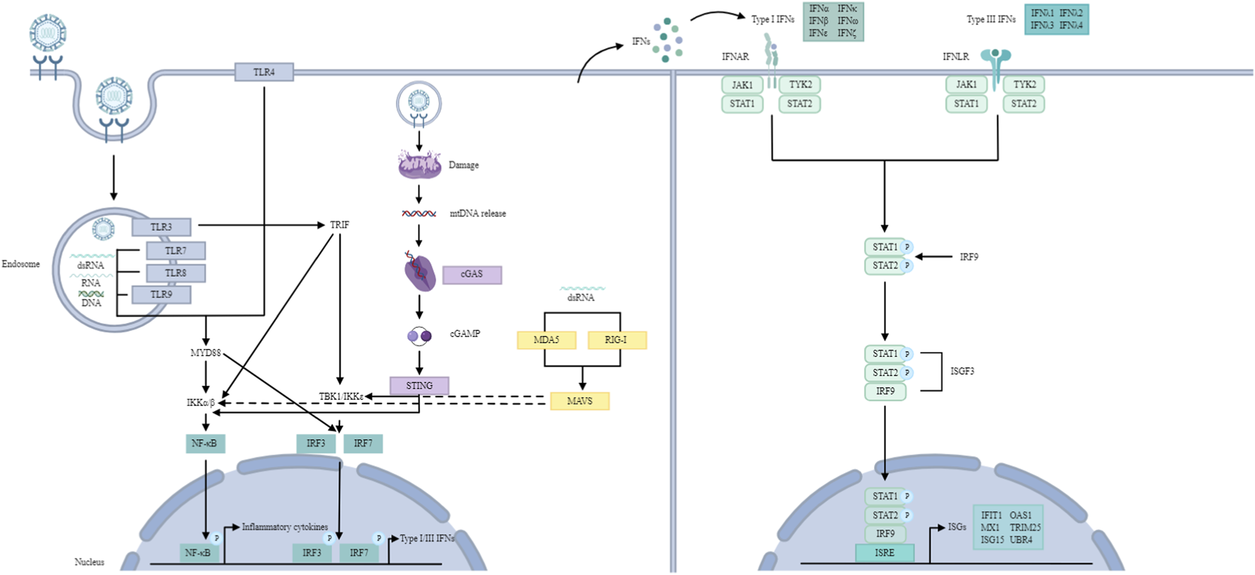 IFN signalling pathway. TLR signalling pathway: TLRs recognize dsRNA, ssRNA and unmethylated CpG DNA. TLR3 and TLR4 utilize the TRIF-dependent pathway to activate IRF3 and NF-κB, inducing type I IFNs and inflammatory cytokines. Other TLRs (with the exception of TLR3) utilize the MYD88-dependent pathway to activate NF-κB and inflammatory cytokines. TLR7-MYD88 signalling induces IFNs through the phosphorylation and translocation of IRF7. RLR signalling pathway: RLRs recognize dsRNA. RIG-I and MDA5 then activate MAVS, which recruits and activates TBK1 and IKK to phosphorylate IRF3/7 and NF-κB, resulting in type I and III IFN production. cGAS/STING pathway: cGAS recognizes mtDNA. Later, cGAS leads to cGAMP synthesis, which activates STING, resulting in the activation of TBK1 and IKK, ultimately producing type I IFNs. JAK/STAT pathway: Type I and III IFNs bind to their receptors, activating JAK1 and TYK2, leading to the formation of ISGF3, which translocates to the nucleus and binds to ISREs, inducing ISGs.