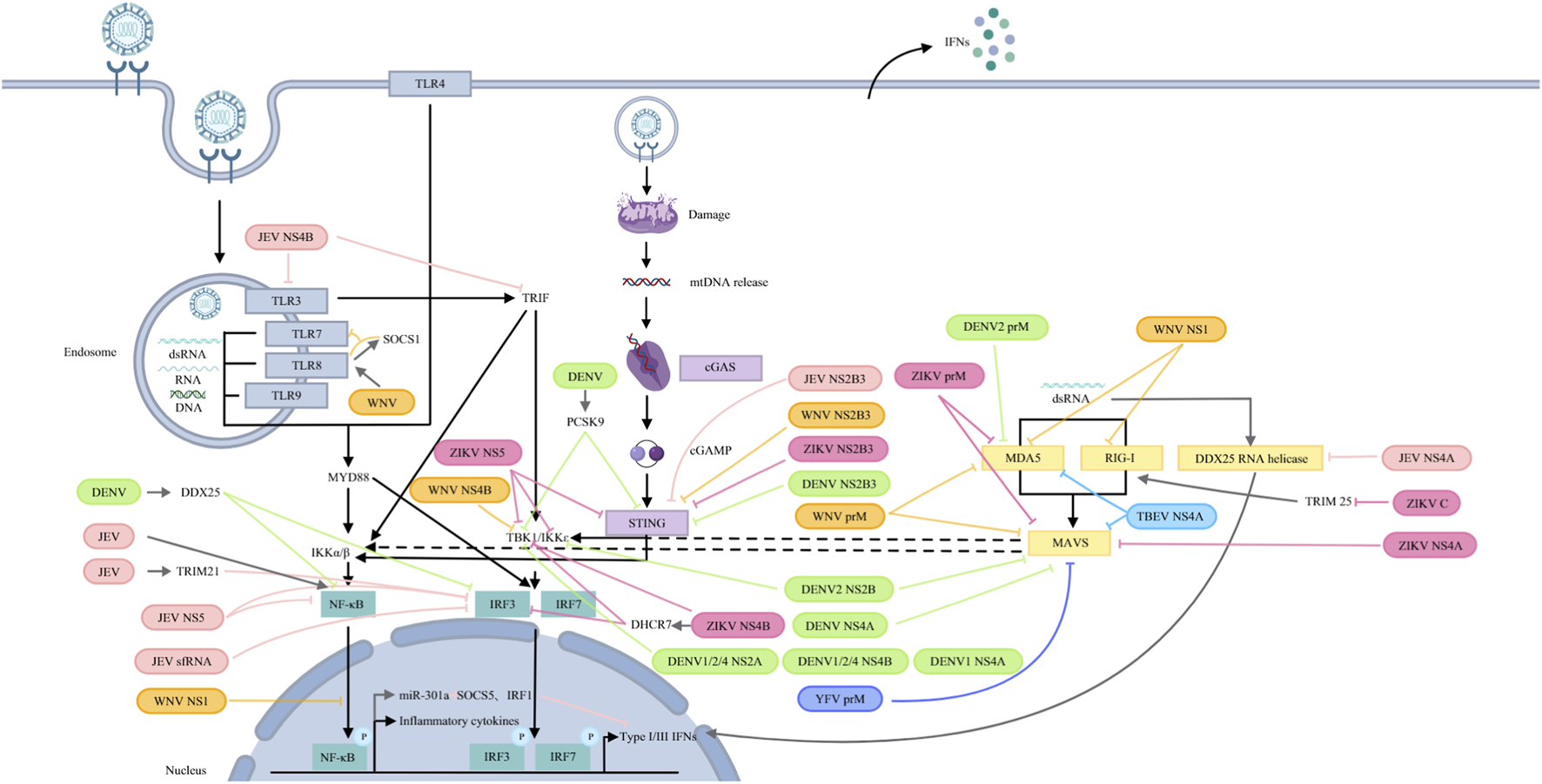 Orthoflaviviruses target PRRs and their signalling pathways. JEV: NS5 blocks IRF3 and NF-κB nuclear translocation; NS4B targets TLR3 and TRIF; and NS4A inhibits DDX42 RNA helicase activity. JEV infection induces TRIM21, attenuating IRF3 phosphorylation. JEV sfRNA inhibits IRF3 phosphorylation and nuclear translocation. JEV activates NF-κB to induce miR-301a, which reduces IRF1 and SOCS5 to antagonize IFN-β production. NS2B3 cleaves STING. WNV: prM interacts with MDA5 and MAVS; NS1 interacts with and degrades RIG-I and MDA5 and suppresses NF-κB activation; NS4 blocks TBK1 phosphorylation and activation. TLR8 signalling upregulates SOCS1, which couples with TLR8 to inhibit TLR7 and ISG56. NS2B3 cleaves STING. DENV: DENV2 prM interacts with MDA5, while NS2B binds to MAVS and IKK. DENV 1/2/4 NS2A and NS4B block TBK1 activation. DENV1 NS4A inhibits TBK1-directed IFN production. DENV NS4A binds to MAVS. DENV NS2B3 cleaves STING. DENV infection increases PCSK9 to inhibit STING and TBK1 phosphorylation and upregulates DDX25 to block IRF3 and NF-κB activation. YFV: prM binds to MAVS. ZIKV: prM binds to MDA5 and MAVS. C interacts with TRIM25 to inhibit RIG-I ubiquitination. NS4A interacts with MAVS. NS4B binds directly to TBK1 and upregulates DHCR7 to inhibit TBK1 and IRF3 phosphorylation. NS5 interacts with TBK1, IKKɛ and STING. NS2B3 cleaves STING. TBEV: prM hinders the interaction between MDA5 and MAVS.