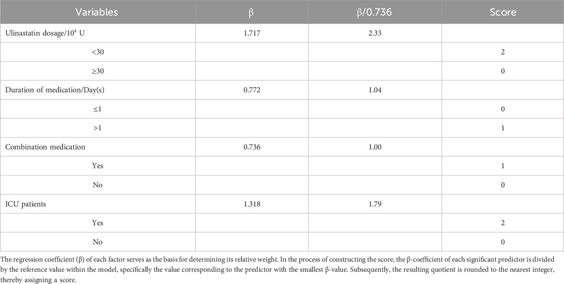 To translate the identified risk factors into a practical tool for preventive health screening, we developed a simple risk scoring system based on the regression coefficients (β) from the multivariable model. The goal was to create an intuitive score that could be easily calculated at the point of care to guide clinical behavior. The smallest β-value (0.736, for concomitant medication use) was used as the reference to standardize point assignments. The relative weight for each variable was calculated by dividing its β-coefficient by this reference value, followed by rounding to the nearest integer to assign practical point scores. The resulting points-based tool integrates the four independent risk factors as follows: ulinastatin dosage <30 × 104 U (β = 1.717, standardized value = 2.33, assigned 2 points) and ICU admission (β = 1.318, standardized value = 1.79, assigned 2 points) were the strongest predictors. Medication duration >1 day (β = 0.772, standardized value = 1.05, assigned 1 point) and concomitant medication use (β = 0.736, assigned 1 point) were also included in the scoring system. This yields a total risk score ranging from 0 to 6. The detailed derivation is shown in Table 5. This risk scoring system transforms complex statistical predictions into a readily applicable clinical tool. By allowing for the immediate stratification of patients into distinct risk categories based on routinely available data, it facilitates proactive, evidence-based decision-making. This directly supports the promotion of safer medication practices by enabling clinicians to identify high-risk patients prior to or during treatment, thereby targeting monitoring resources and guiding preventive strategies.