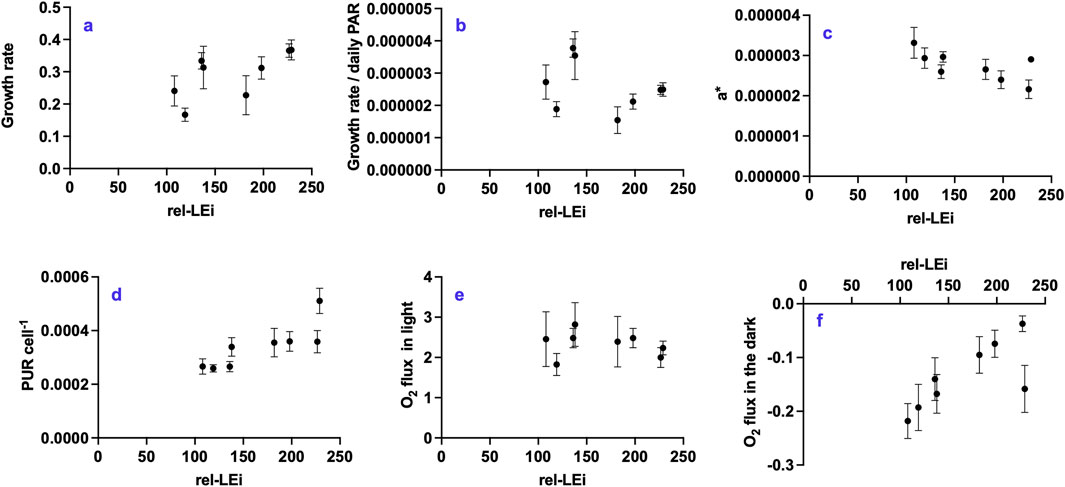 Figure 2. Distribution of the physiological parameters with respect to the rel-LEi (μmol photons m-2s-1): (a) growth rate (d-1); (b) growth rate/daily PAR ratio ((μmol photons m-2)−1); (c) a* (m2 cell-1); (d) PUR cell-1 (μmol photons s-1 cell-1); (e) O2 flux (pmol h-1 cell -1) during incubation in light; (f) O2 flux (pmol h-1 cell -1) during incubation in dark. Rel-LEi: relative light energy index (estimated according to Pistelli et al. (2023)).