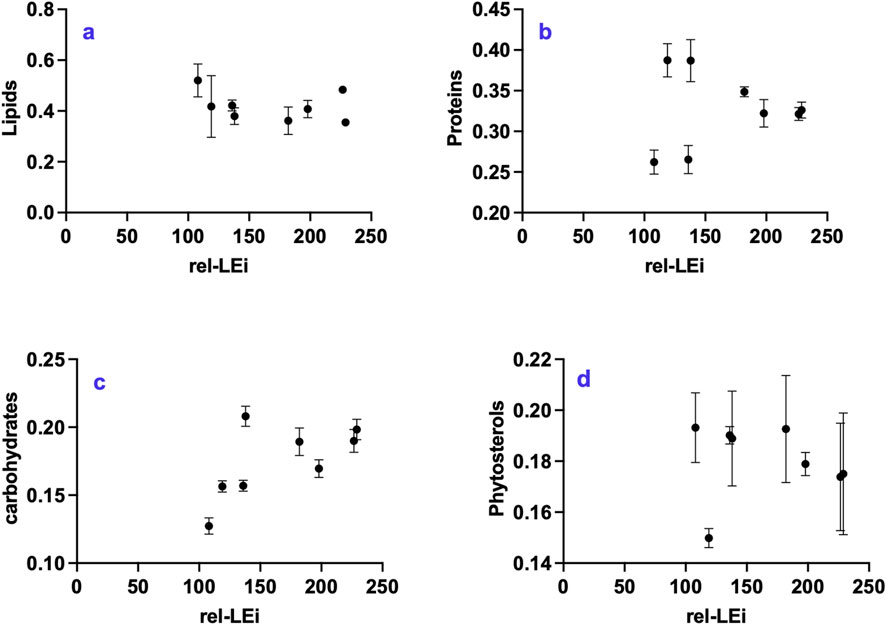Figure 3. Distribution of primary metabolite classes with respect to the rel-LEi (μmol photons m-2s-1): (a) Lipids (mg mg-1 DW); (b) proteins (mg mg-1 DW); (c) carbohydrates (mg mg-1 DW); (d) sterols (mg mg-1 DW). Rel-LEi: relative light energy index (estimated according to Pistelli et al. (2023)).