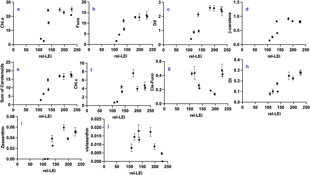 Figure 4. Distribution of pigment concentrations with respect to the rel-LEi (μmol photons m-2s-1): (a) Chlorophyll a (Chl.a, μg mg-1 DW); (b) fucoxanthin (fuco, μg mg-1 DW); (c) Diadinoxanthin (Dd, μg mg-1 DW); (d) ß-carotene (μg mg-1 DW); (e) sum of carotenoids (μg mg-1 DW); (f) Chlorophyll c (Chl.c; μg mg-1 DW); (g) Cis-fucoxanthin (cis-fuco; μg mg-1 DW); (h) Diatoxanthin (Dt, μg mg-1 DW); (i) Zeaxantin (zea; μg mg-1 DW); (j) Violaxanthin (viol; μg mg-1 DW). Rel-LEi: relative light energy index (estimated according to Pistelli et al., 2023).