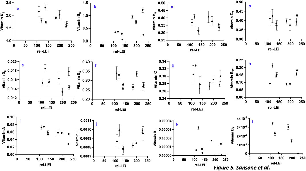 Figure 5. Distribution of vitamins with respect to the rel-LEi (μmol photons m-2s-1): (a) Vitamin k1 (μg mg-1 DW); (b) Vitamin B6 (μg mg-1 DW); (c) Vitamin B8 (μg mg-1 DW); (d) Vitamin D2 μg mg-1 DW); (e) Vitamin D3 (μg mg-1 DW); (f) Vitamin B2 (μg mg-1 DW); (g) Vitamin C (μg mg-1 DW); (h) Vitamin B12 (μg mg-1 DW); (i) Vitamin A (μg mg-1 DW); (j) Vitamin E (μg mg-1 DW); (k) Vitamin B1 (μg mg-1 DW); (l) Vitamin B9 (μg mg-1 DW). Rel-LEi: relative light energy index (estimated according to Pistelli et al. (2023)).