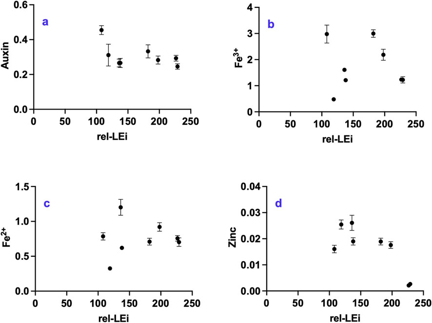 Figure 6. Distribution of (a) auxin (pmol mg-1 DW); (b) Fe3+ (nmol mg-1 DW); (c) Fe2+ (nmol mg-1 DW); (d) Zinc (nmol mg-1 DW) with respect to the rel-LEi (μmol photons m-2s-1). Rel-LEi: relative light energy index (estimated according to Pistelli et al. (2023)).