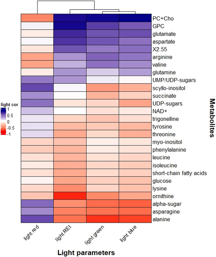 Metabolites correlated with rel-LEi were generally related to blue light (Figure 7). Blue light positively affected choline moieties, including choline, phosphocholine (PC), and glycerophosphocholine and the amino acids glutamine, glutamate, aspartate, arginine, and valine (Figure 7). Choline is involved in lipid metabolism as precursor of phospholipids (Zhang et al., 2021), and therefore plays a role in response to abiotic stress.