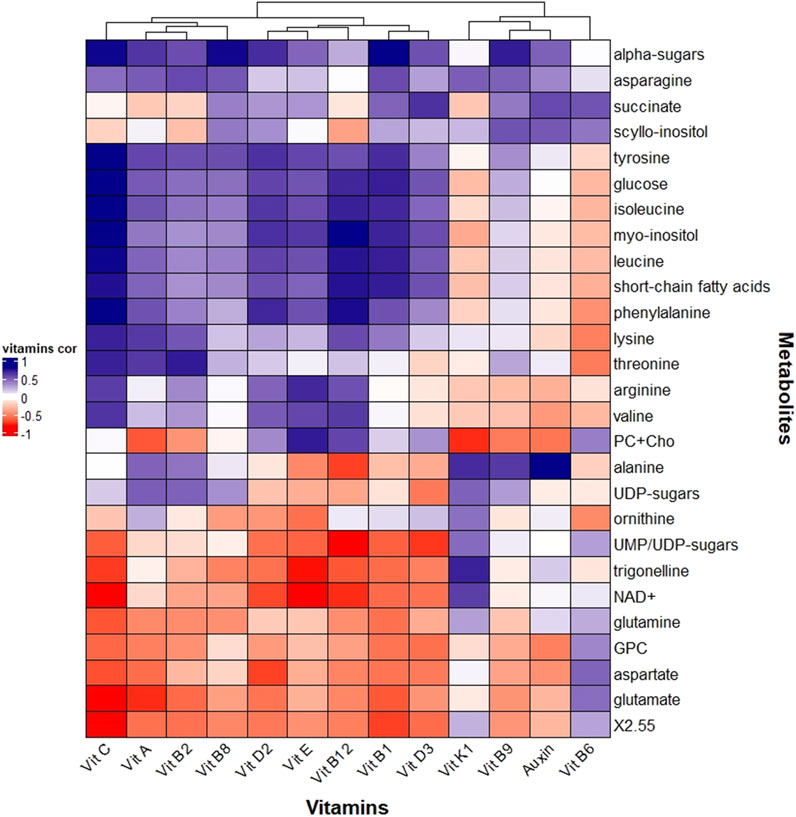 Figure 8. Heatmap correlation between Odontella aurita metabolomic data and vitamins and auxin. Pearson correlation was calculated based on the Euclidean distance for the metrics and the mean method for clustering criterion.